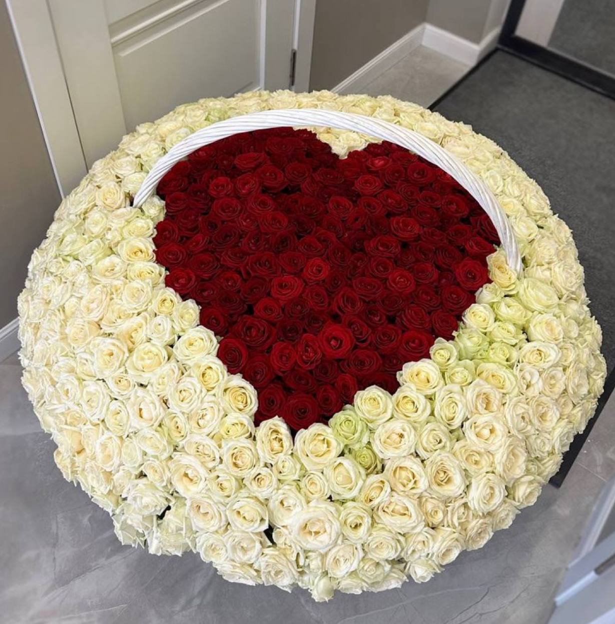 Тысяча и одна роза собраны в объёмную корзину, где каждый белоснежный бутон создаёт плотное облако лепестков. Это композиция, которая заполняет пространство и меняет восприятие комнаты одним своим присутствием.