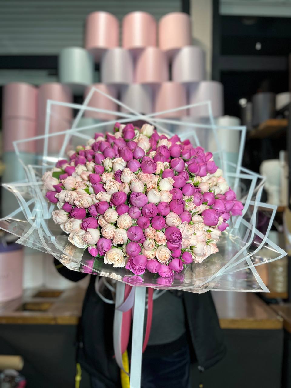 Масштабная композиция из ста одной кустовой пионовидной розы занимает всё внимание. Множество бутонов с волнистыми лепестками создают живую фактуру и впечатляющее присутствие в любом пространстве.