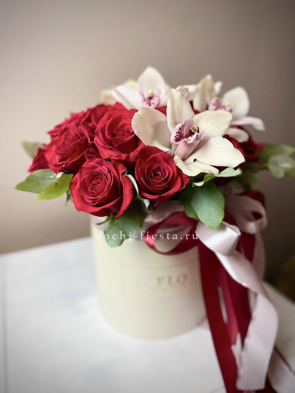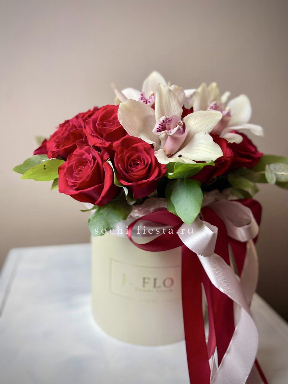 белые розы, цилиндр D20, эвкалипт, лента, упаковка.