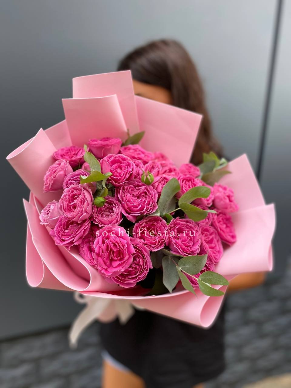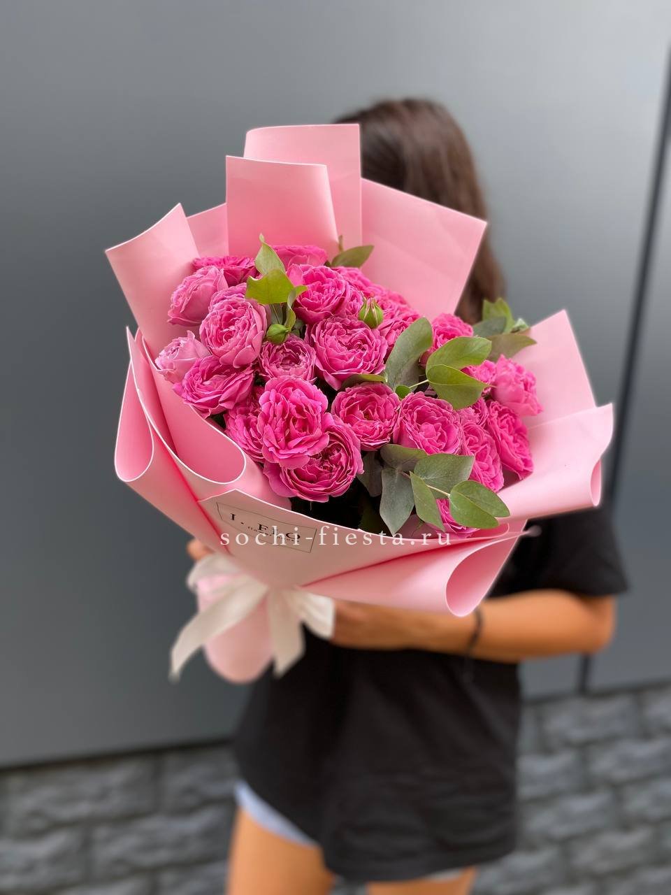 пионовидная кустовая кустовая роза Мисти Баблс, статица, лента, дизайнерская упаковка.