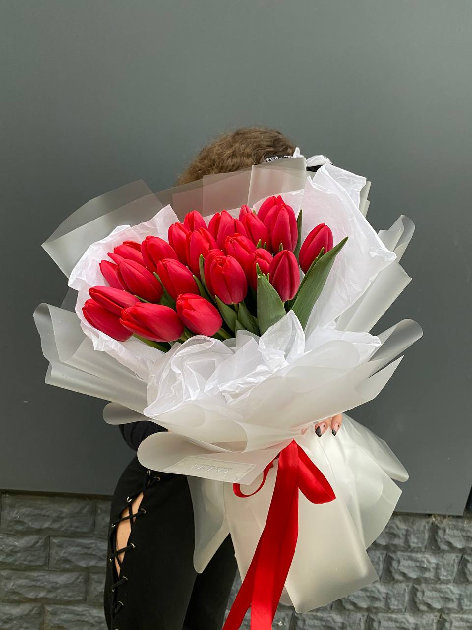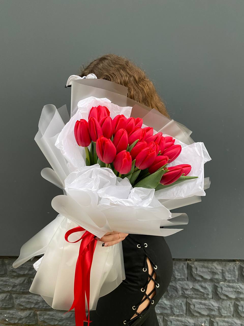 Пятьдесят пять бутонов собраны в плотную округлую форму, где каждый цветок читается отдельно. Красный здесь звучит насыщенно и глубоко, создавая мощное визуальное присутствие. Букет держит форму и занимает пространство уверенно.