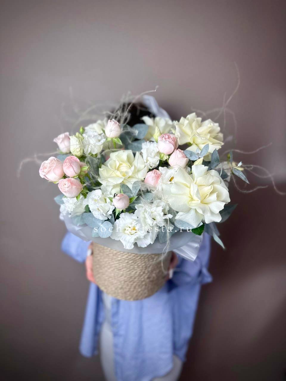 Французские и пионовидные розы белого цвета соседствуют с воздушными метёлками ковыля и соцветиями эустомы. Композиция собрана в цилиндре и помещена в джутовое кашпо для устойчивости.