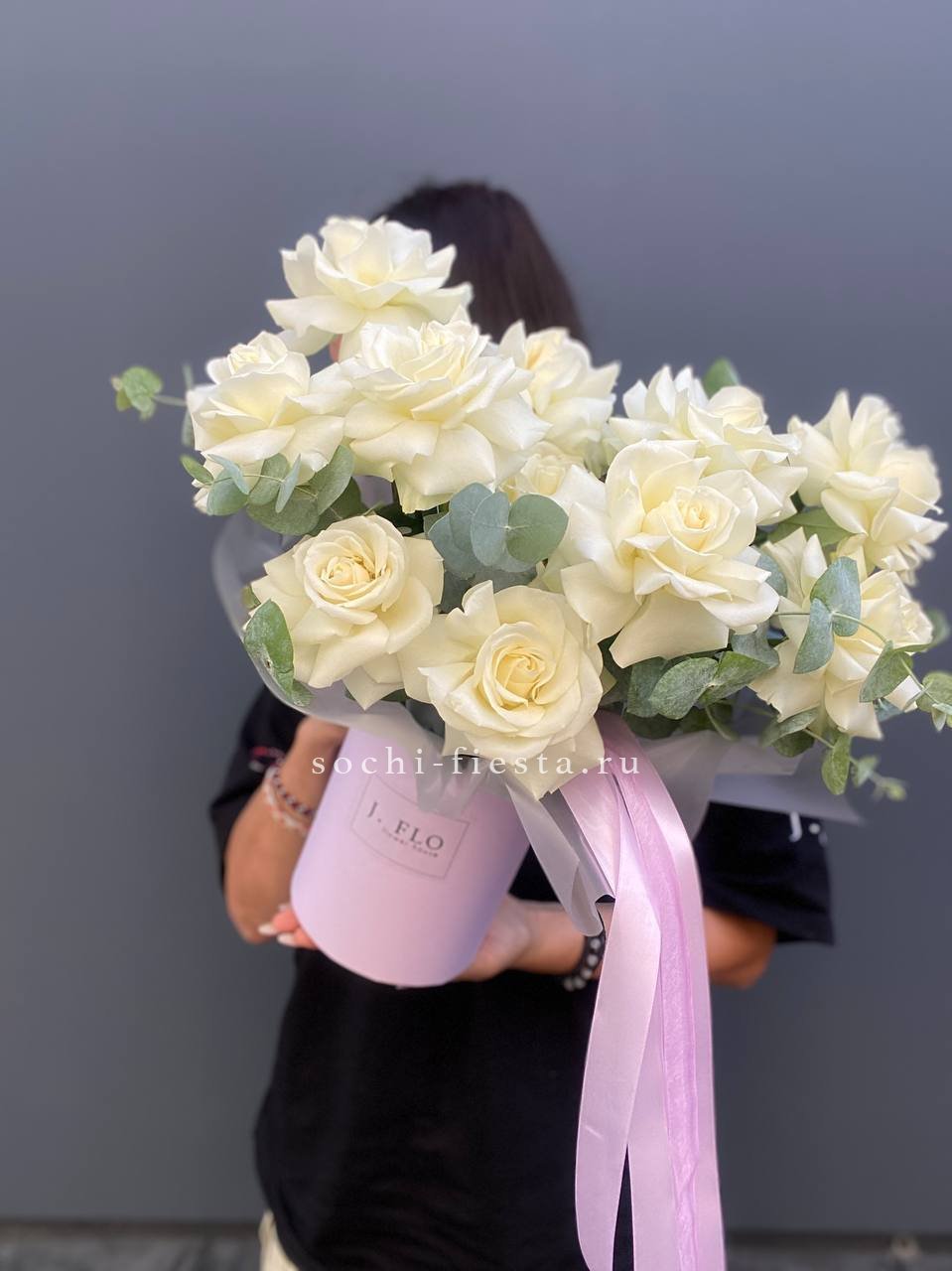 белые французские розы, пионовидные розы, ковыль,эустома, эвкалипт, цилиндр D16.