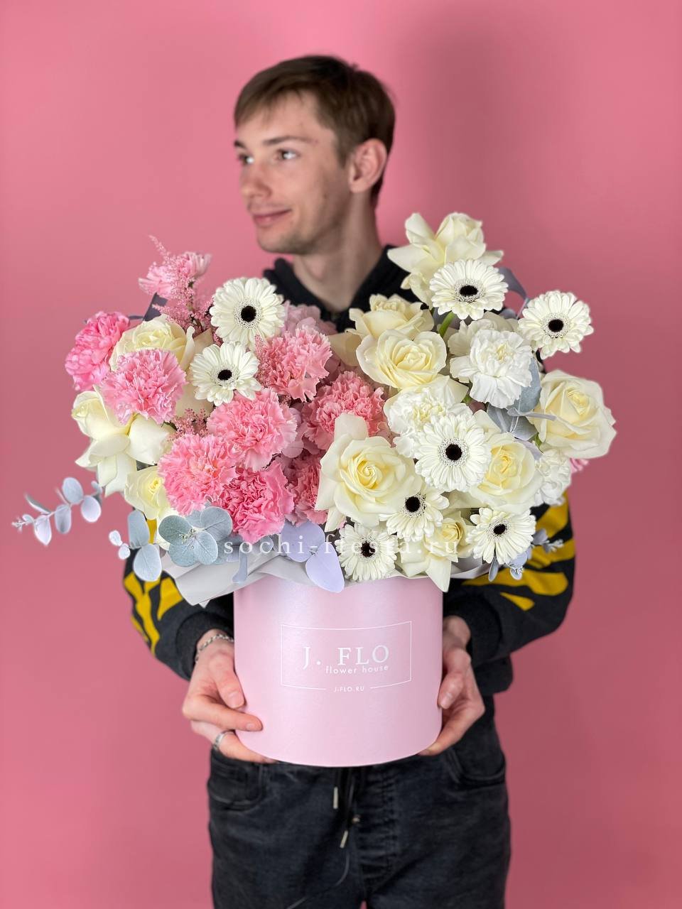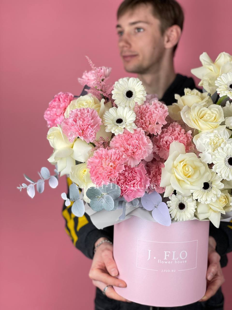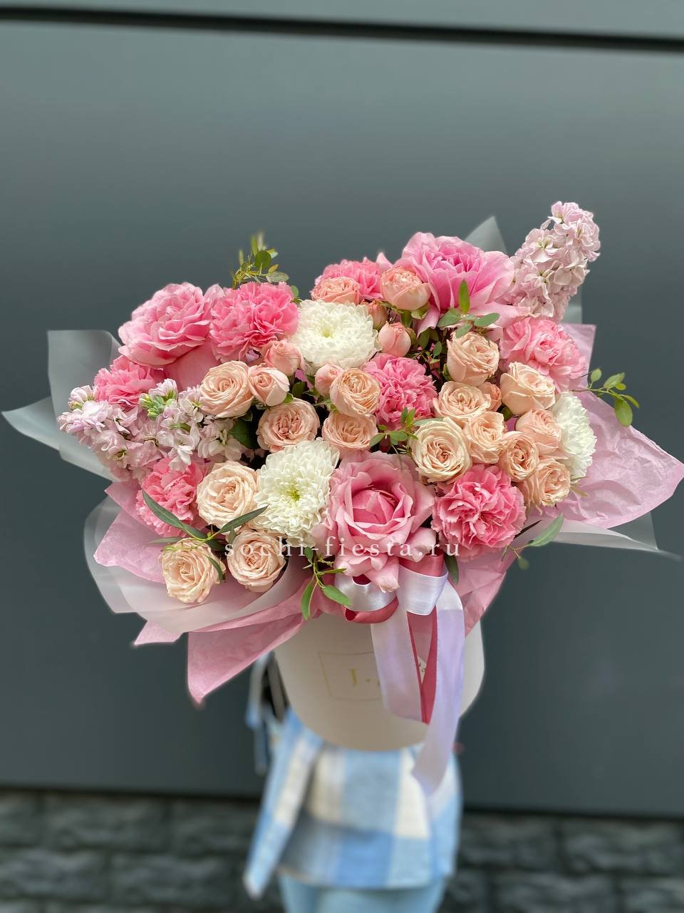Настоящий цветочный фейерверк в стильной коробке! Эта пышная и многосоставная композиция притягивает взгляды богатством форм и оттенков — от кремового и персикового до насыщенного розового и белого. Это не просто цветы, а целая история о радости, празднике и восхищении. Подарок, который гарантированно произведет яркое впечатление и останется в памяти надолго.