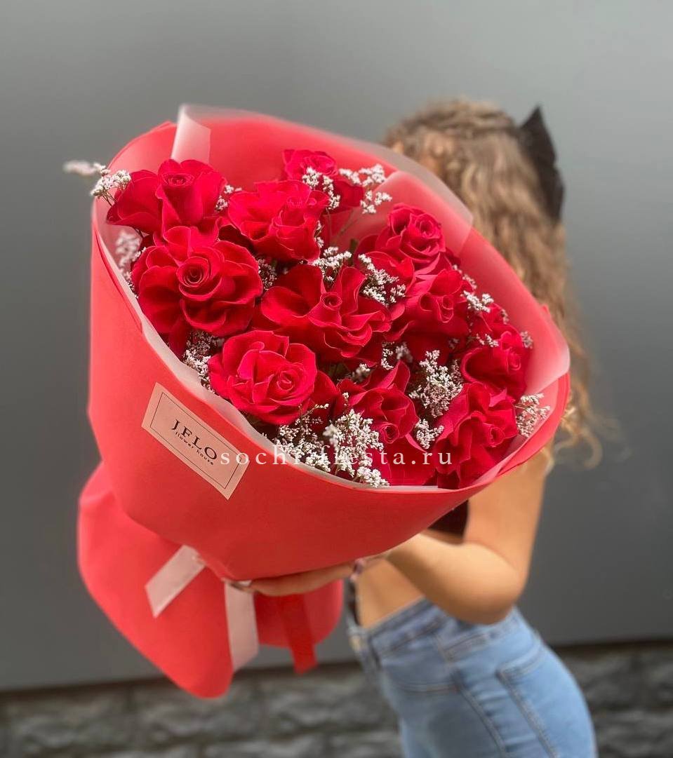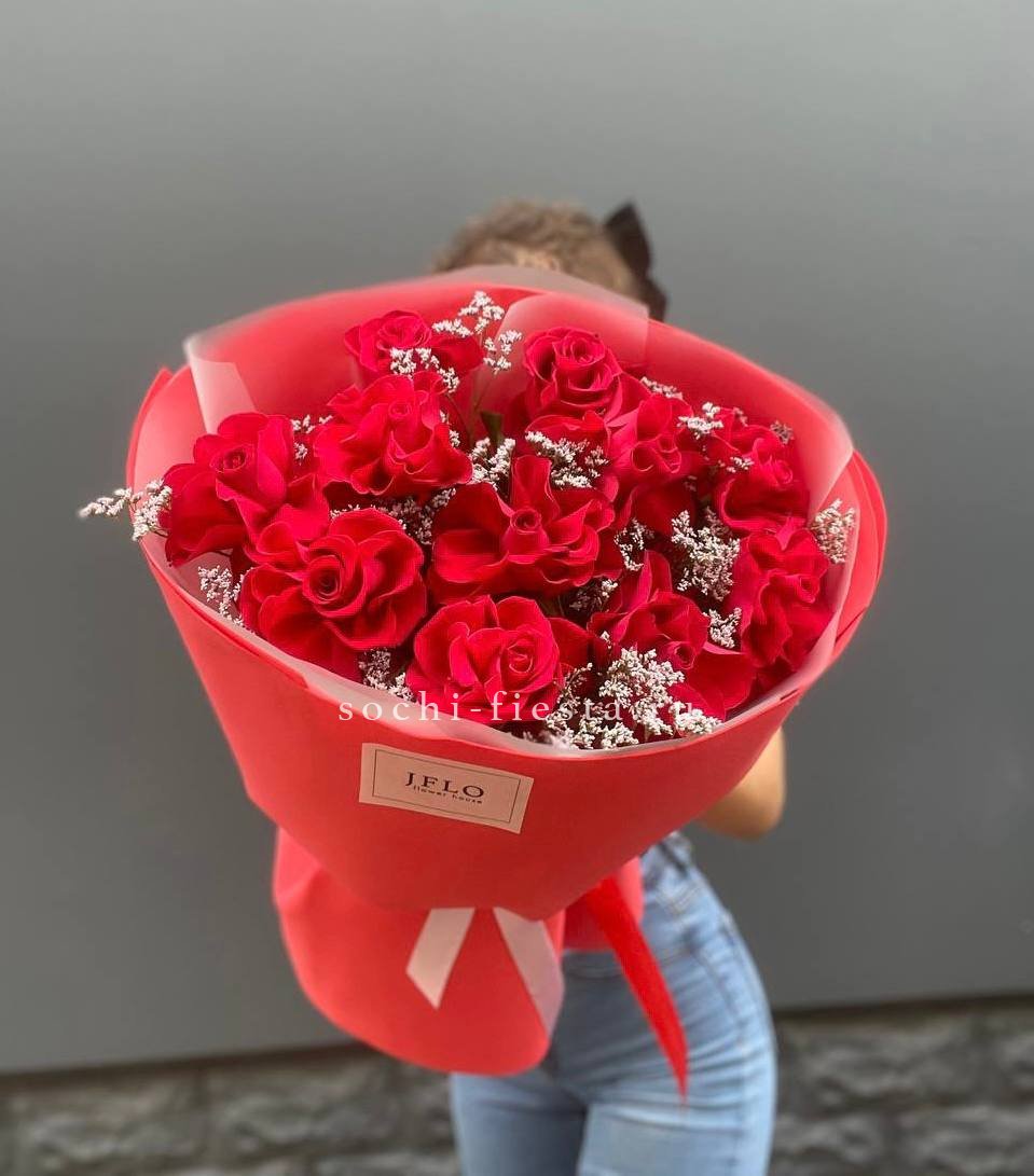 Одиннадцать алых бутонов собраны в плотную вертикальную форму с добавлением воздушного лимониума. Букет держит линию и создает яркое присутствие в любом пространстве.