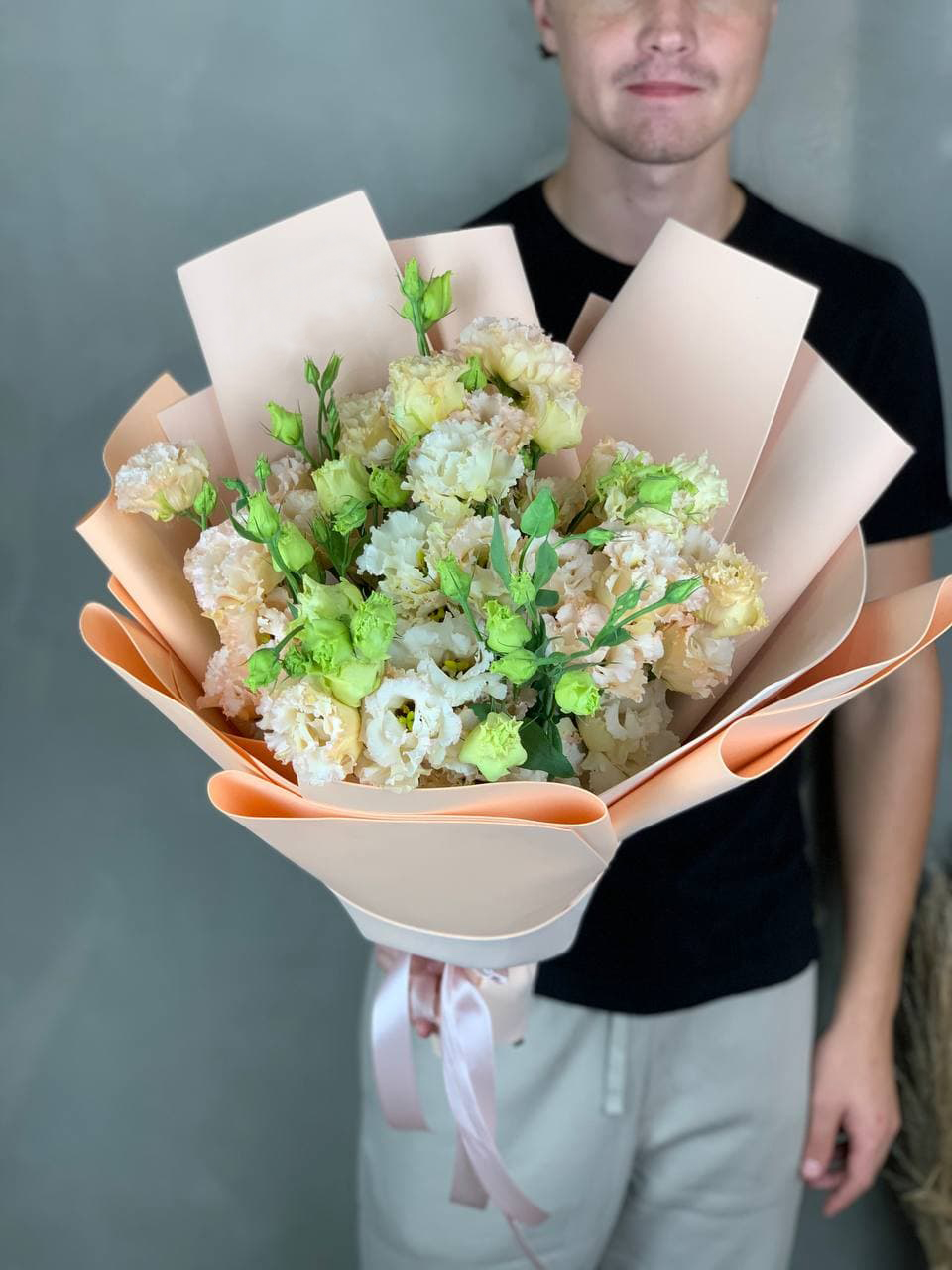 Охапка эустомы в свободной упаковке – чистая форма без усложнений. Веточки располагаются свободно, создавая лёгкий ритм и воздушное присутствие. Монобукет для современного интерьера и минималистичной эстетики.