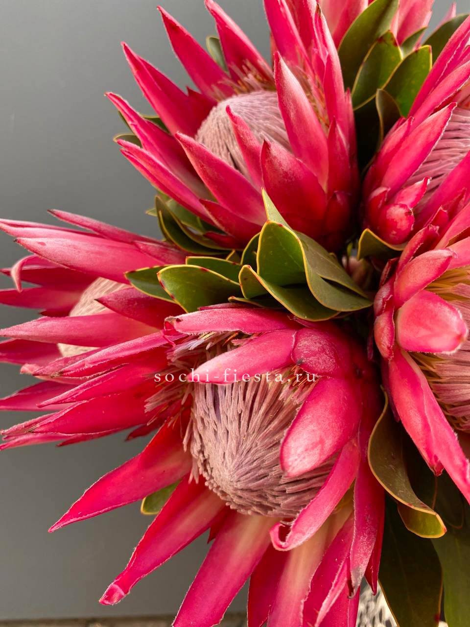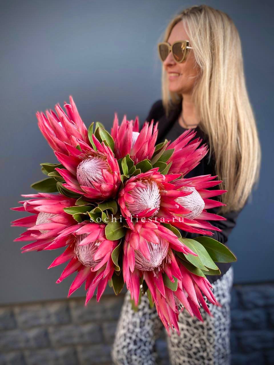 Три крупных соцветия протеи образуют графичную композицию с выраженной архитектурой. Сезонная зелень усиливает структурность линий и создаёт визуальную глубину. Букет для пространств с современной эстетикой и смелыми акцентами.