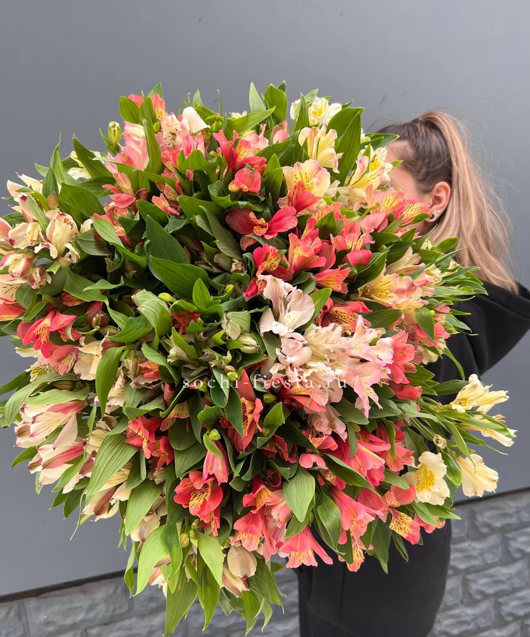 Пятьдесят одна ветка альстромерий — это масштабная композиция с выраженным визуальным присутствием. Букет заполняет пространство и привлекает внимание своим объёмом.