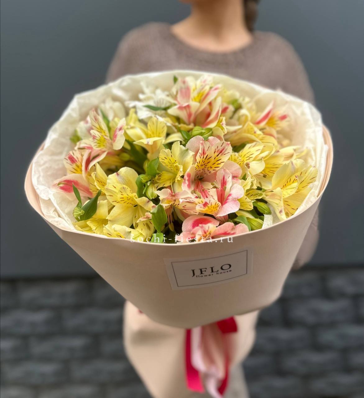 Девять альстромерий в воздушной упаковке пастельных оттенков выглядят мягко и свежо. Бутоны разной степени раскрытия добавляют букету глубины и лёгкой игривости.