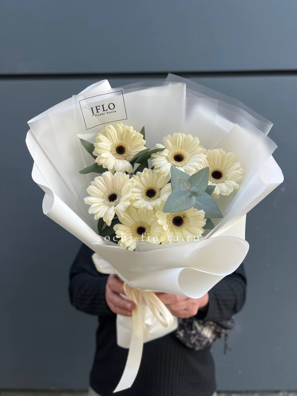 Пятьдесят один бутон под лентой — это объём и яркое присутствие в любом помещении. Герберы выстроены плотно, образуя впечатляющую композицию. Такой букет сложно не заметить.