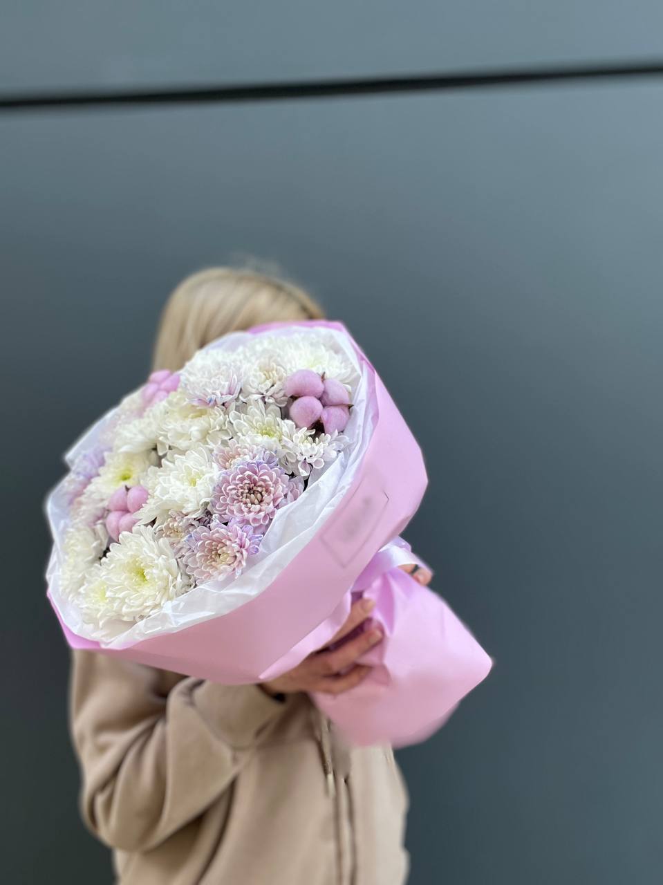 Семь пышных хризантем с коробочками хлопка собраны в мягкую композицию пастельных оттенков. Воздушная сборка и естественные линии создают ощущение легкости. Букет для тихих встреч и теплых слов.