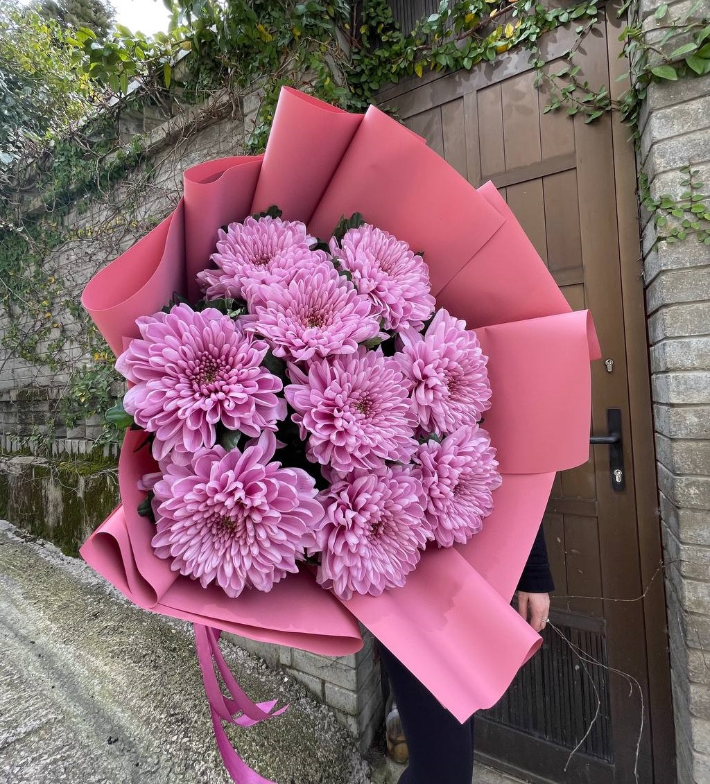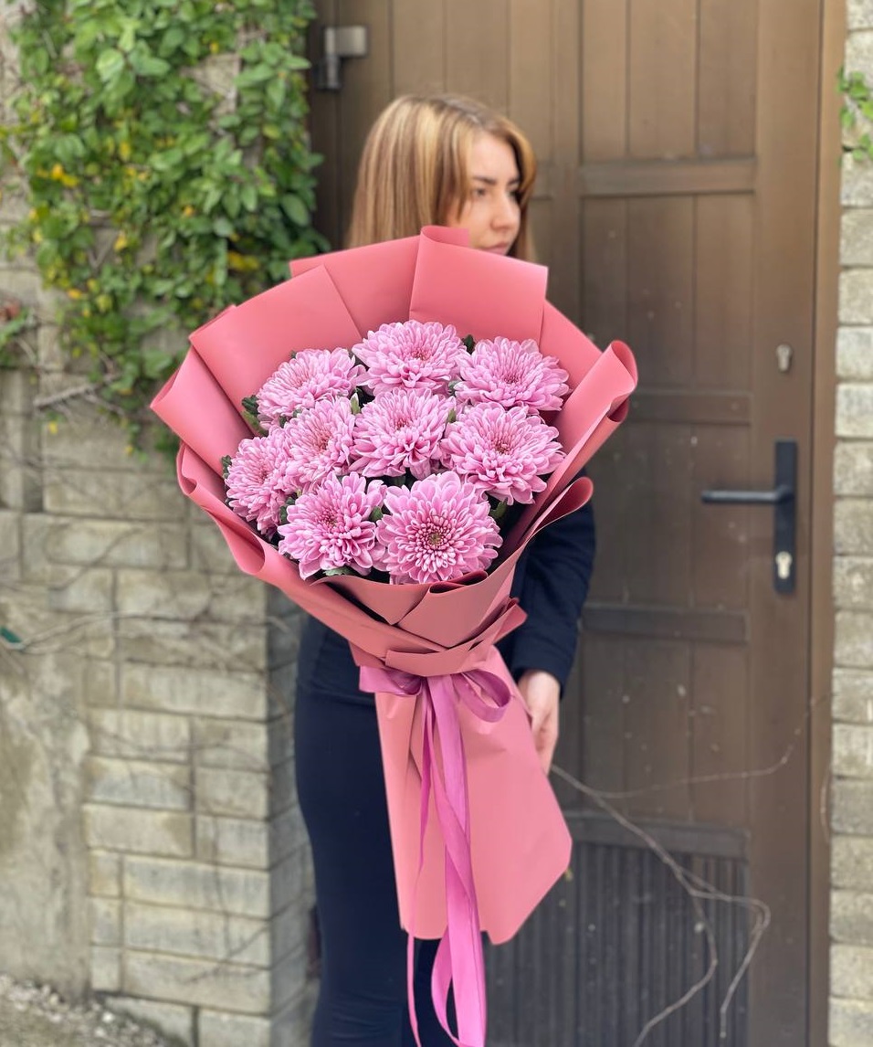 Одиннадцать веток розовой кустовой хризантемы в натуральном крафте. Множество соцветий формируют пышный объем, а естественная подача сохраняет лёгкость и воздушность композиции.