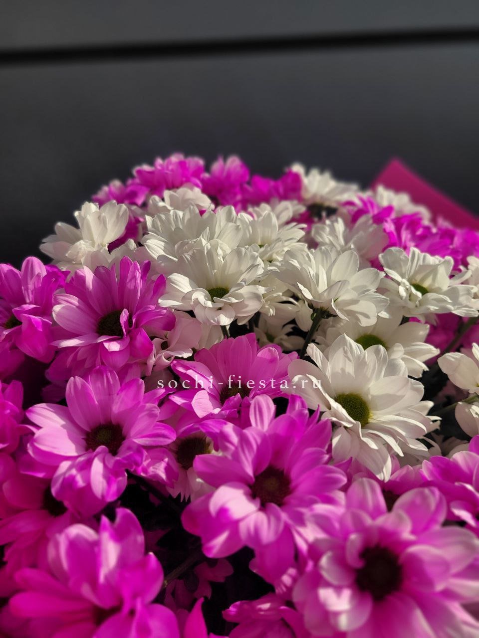 Яркие малиновые соцветия собраны в пышный букет с характерным объёмом. Дизайнерская упаковка подхватывает насыщенный тон и создаёт завершённую форму.