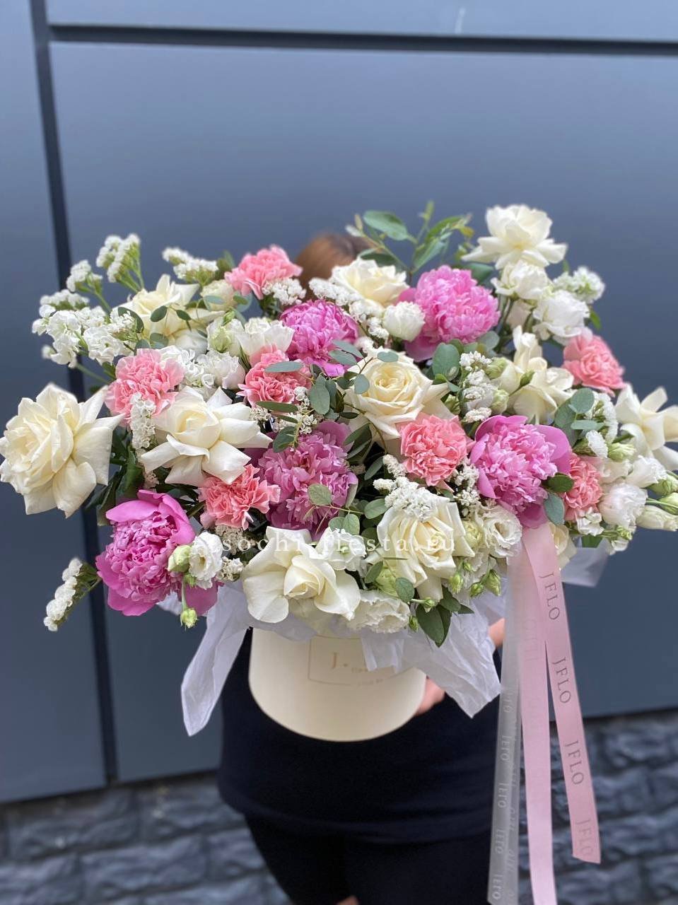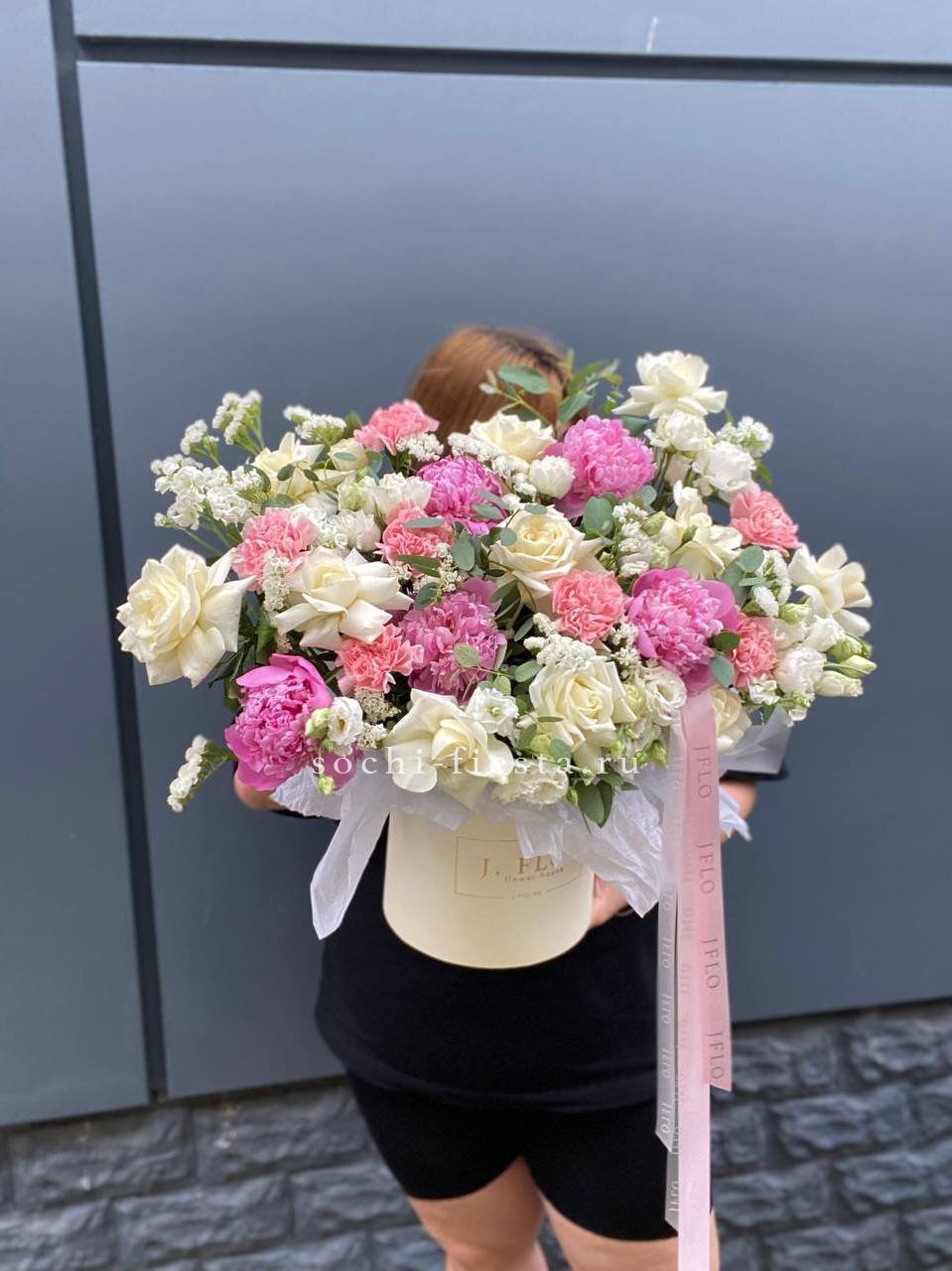 пионовидная роза Мисти Баблс, гортензия, голландские пионы, лента, упаковка.