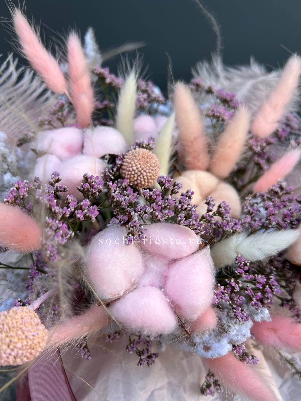 Бокс с природными текстурами: мягкость хлопка, воздушность лагуруса и графичность амаранта. Перья добавляют легкости. Композиция держит форму и не теряет выразительности со временем.