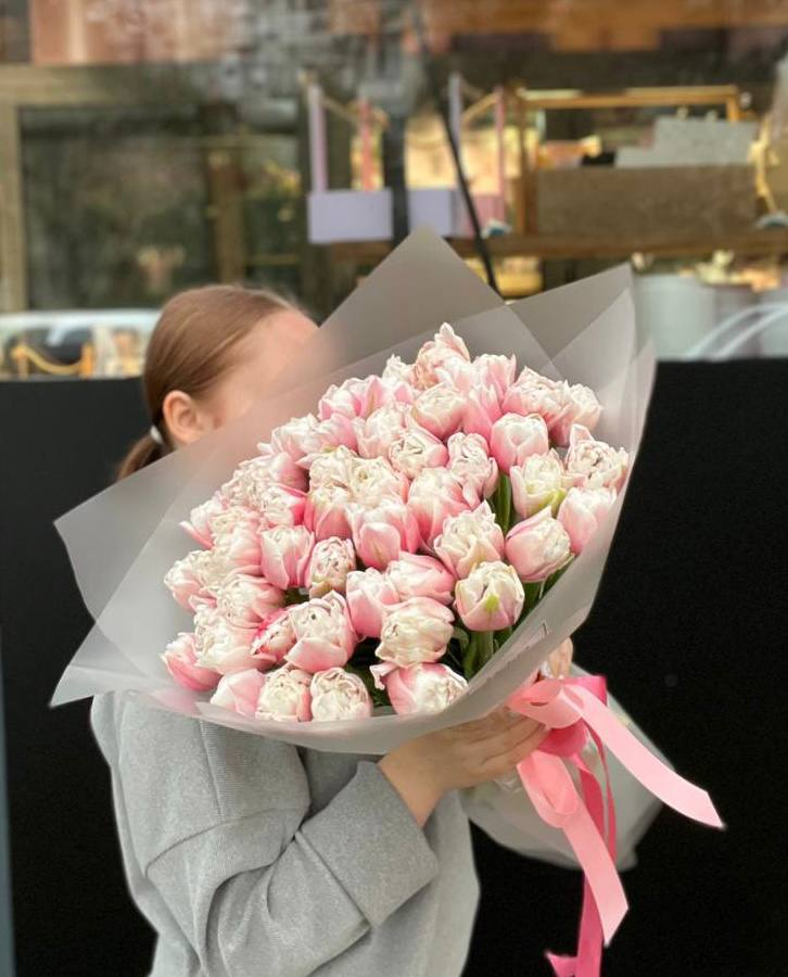 Пятьдесят один тюльпан собран в плотный монохромный букет с мягкими переливами пастельных оттенков. Матовая упаковка сохраняет свежесть бутонов и создает лаконичную форму. Весенняя композиция для тех моментов, когда хочется заполнить пространство цветом и светом.