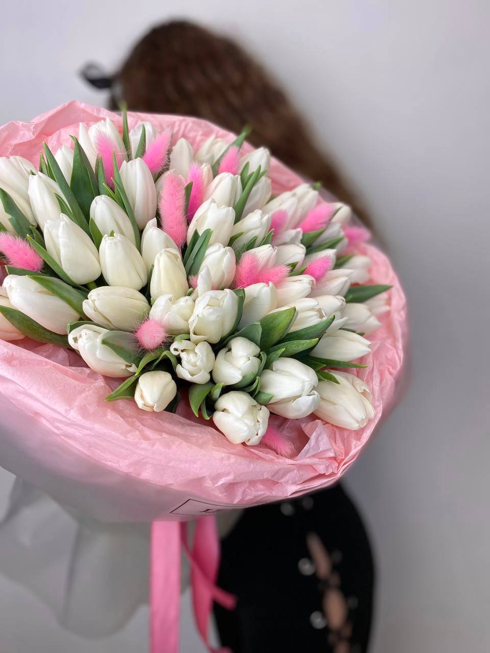 Пятнадцать белоснежных бутонов в лаконичной упаковке держат форму и сохраняют свежесть надолго. Тюльпаны раскрываются постепенно, их лепестки плотные и аккуратные. Композиция удобна для размещения в любой вазе.