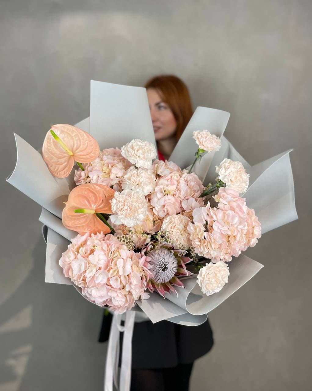 Протея и антуриум задают графичную структуру композиции, а воздушный хамелациум добавляет легкости между крупными формами. Гортензия создает плавные переходы, объединяя все детали в современную авторскую работу.