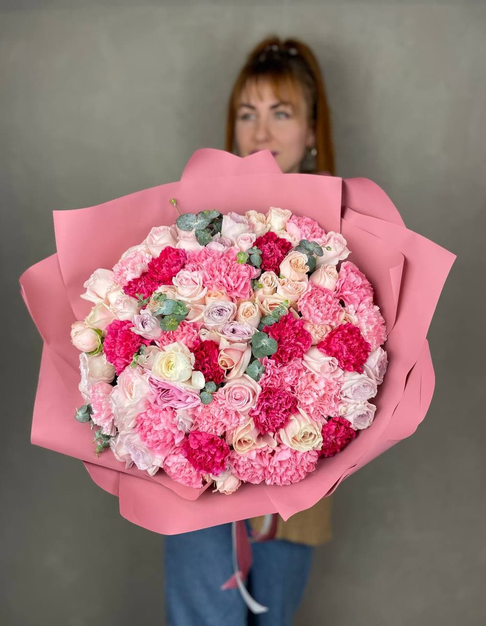 розы, пионовидные кустовые розы, диантусы, эвкалипт, лента, дизайнерская упаковка.
