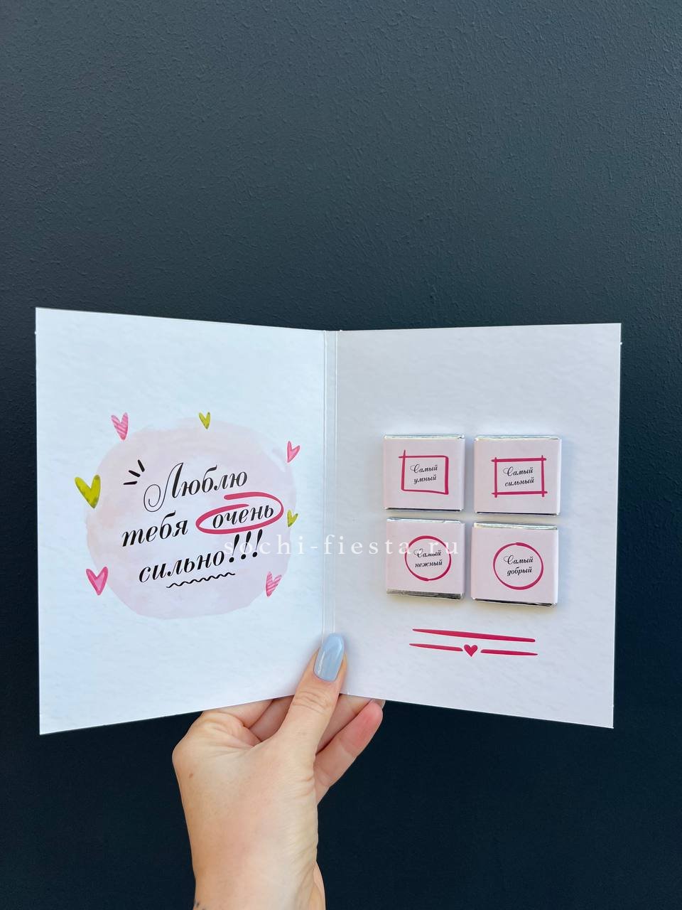 открытка с любовными посланиями на шоколаде. Внутри надпись: Люблю тебя очень сильно!!! Также 4 молочных шоколадки. Размер открытки: 10х15см