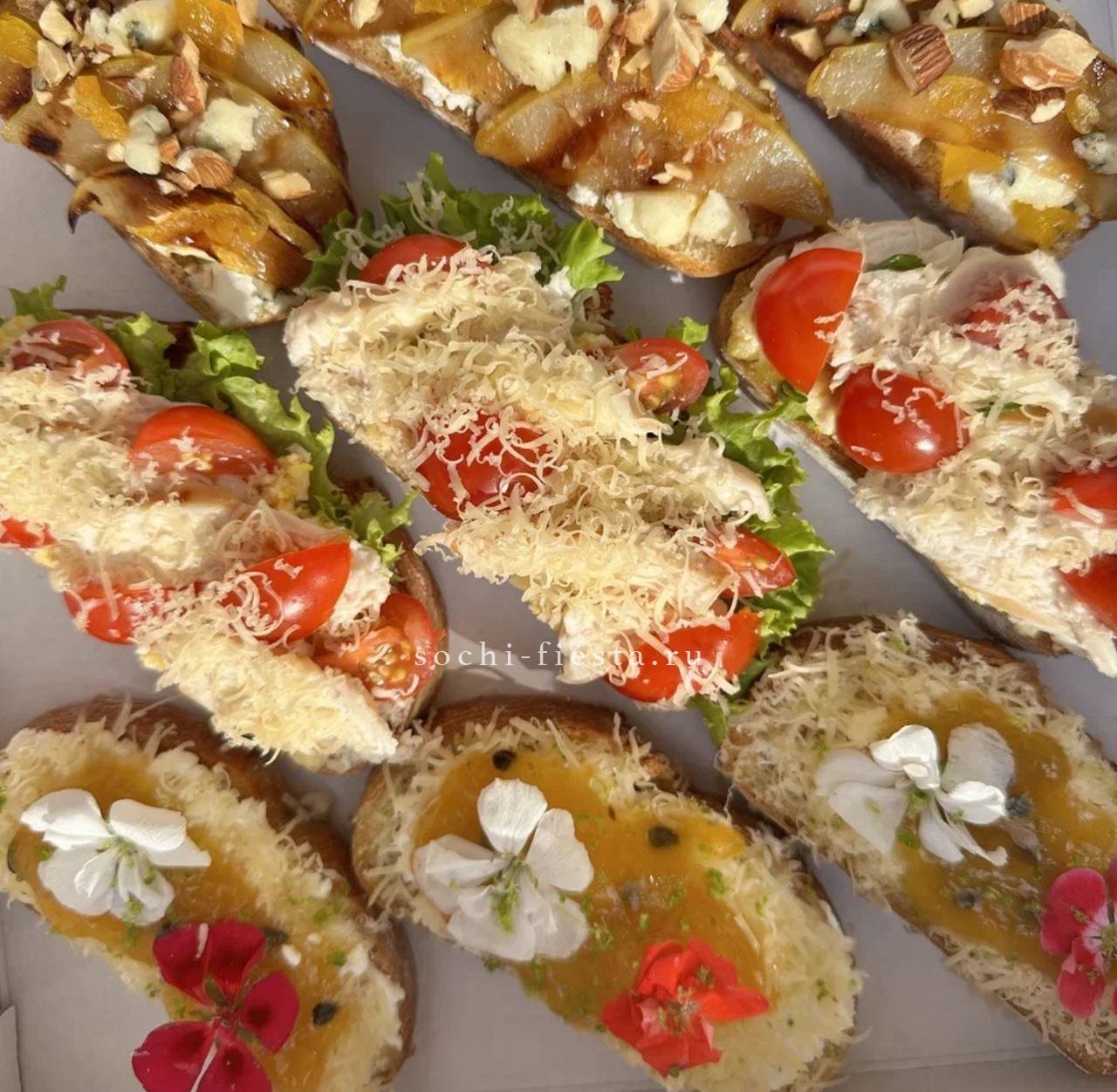 Пятнадцать брускет с разными начинками образуют яркую гастрономическую палитру. Греческие мотивы переплетаются с морскими акцентами, имбирный тунец дополняет свежесть рукколы и креветок.