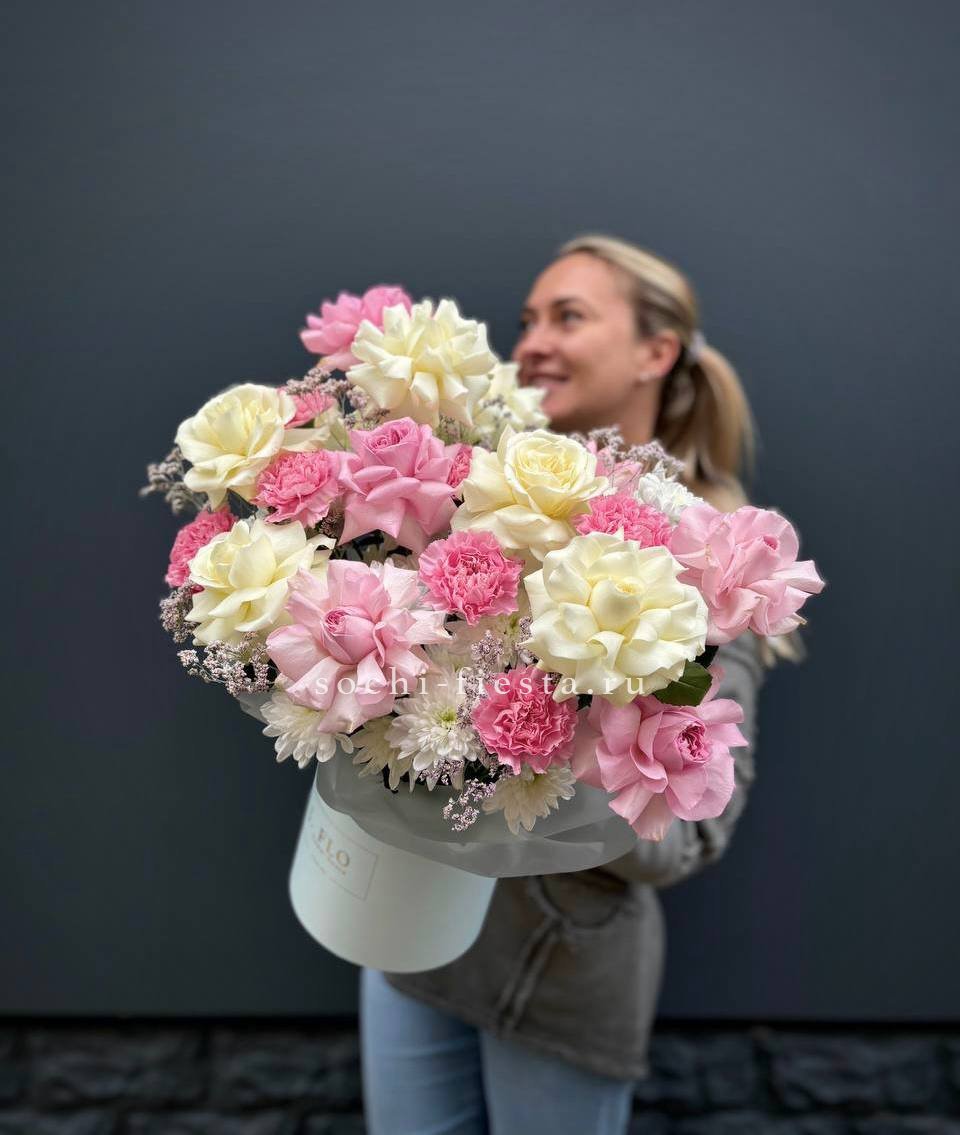 Для заказа товара "Коробка французских роз и диантусов "Бони"" с доставкой в Подольске нажмите в корзину