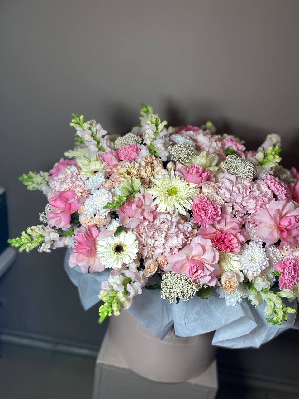 хризантемы, герберы, розы, антиринум, диантус, гортензия, бомбастик, озатамус в коробке или корзине на выбор.