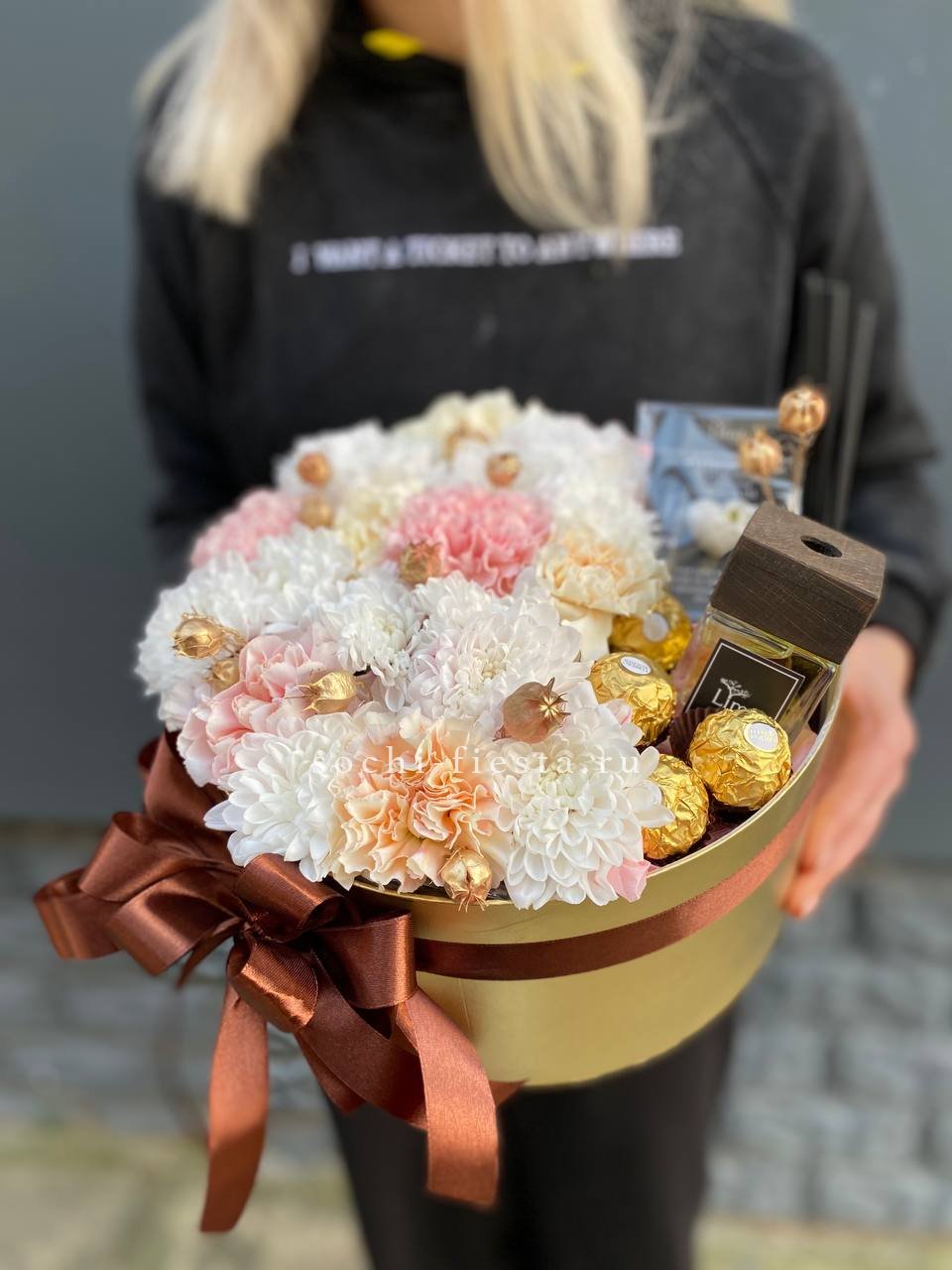 бокс из стойких цветов хризантем и диантусов, с ароматным диффузором.