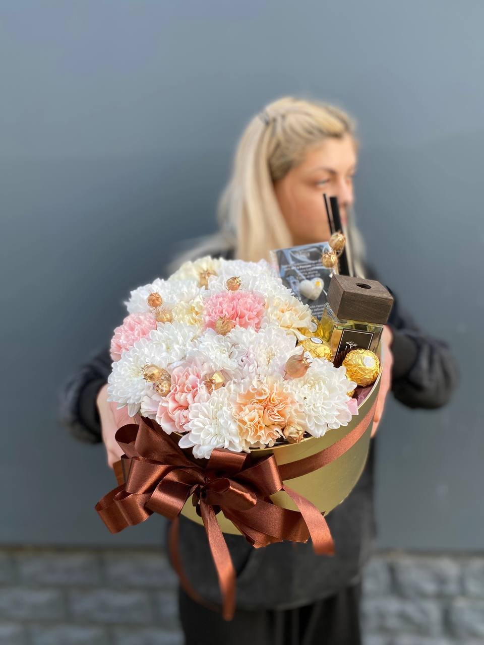 Композиция объединяет живые хризантемы и диантусы с ароматическим диффузором. Цветы сохраняют свежесть долго, а аромат наполняет пространство мягким шлейфом.