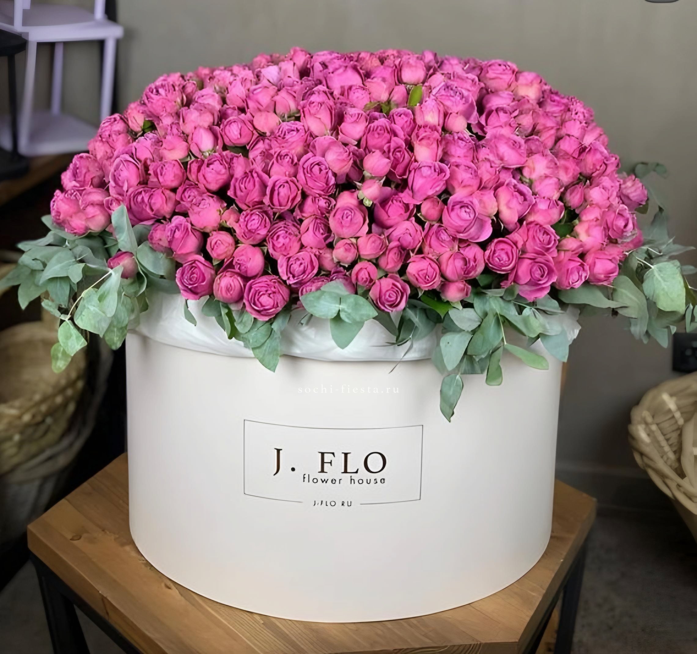 бокс 20D, белая французская роза, эустома, эвкалипт.