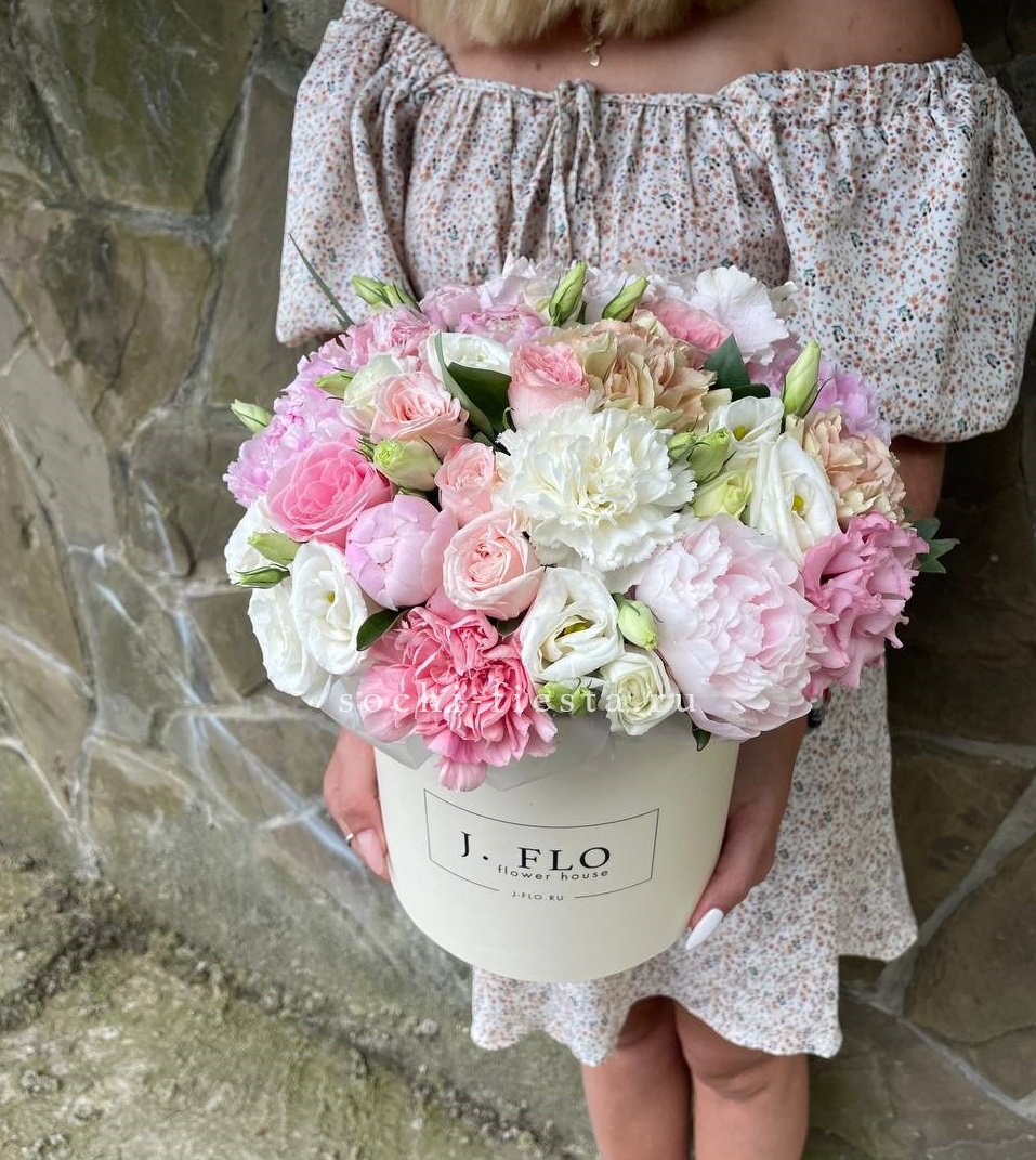 Эустомы и пионовидные розы соседствуют с французскими макарон в коробке в форме сердца. Диантусы и эвкалипт создают объём, а сладкий акцент делает композицию завершённой.