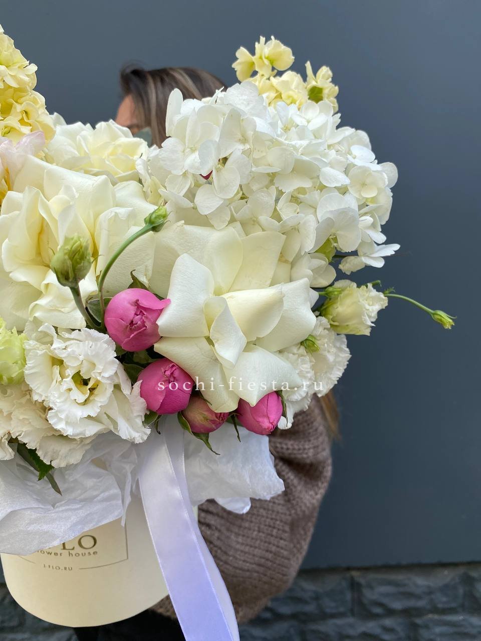 белые французские розы, эустома, гортензия, маттиола,  цилиндр D16.