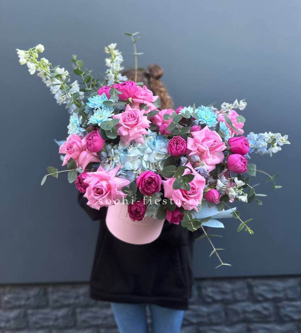 27 розовых роз в шляпной коробке с эвкалиптом.