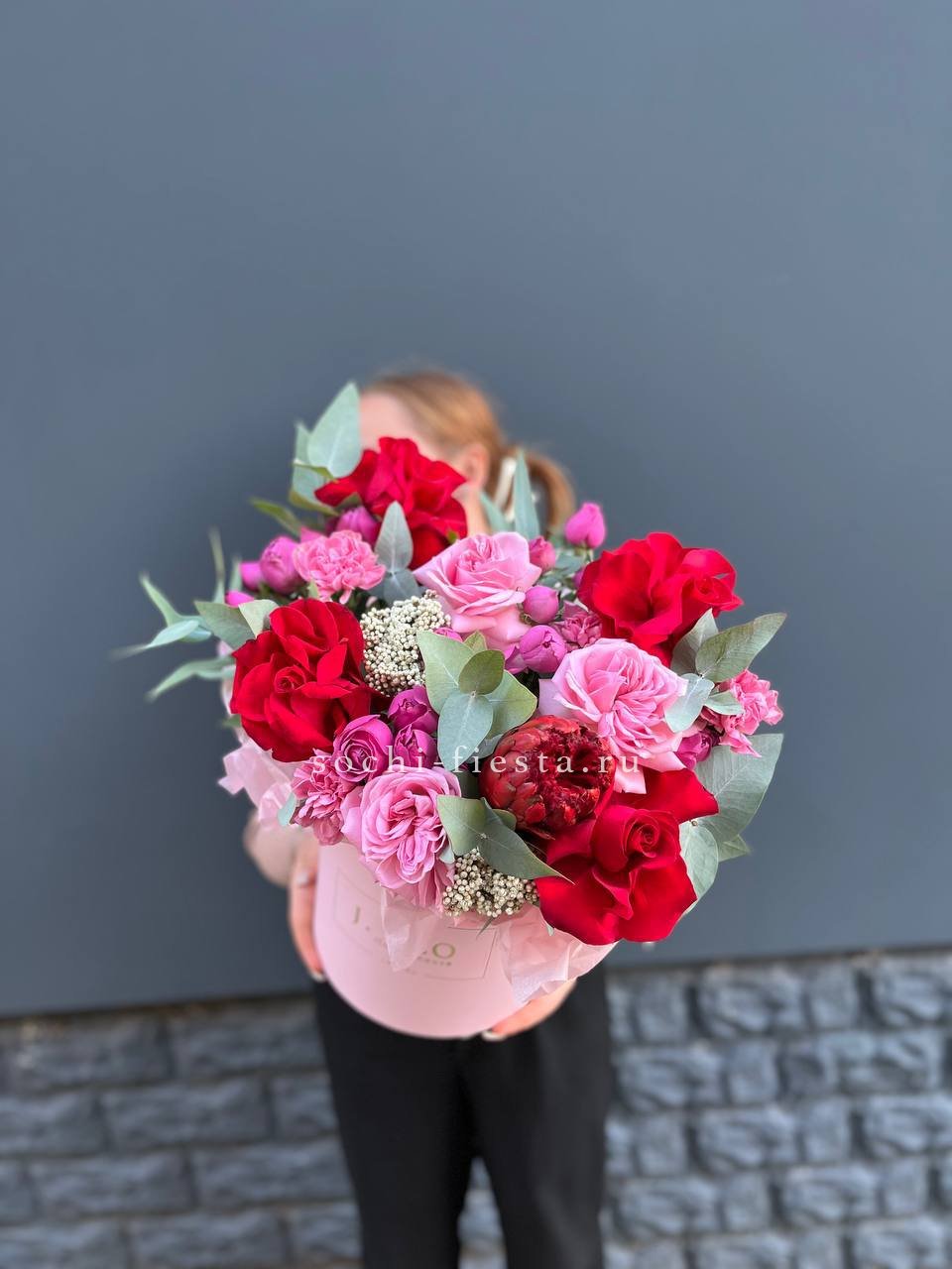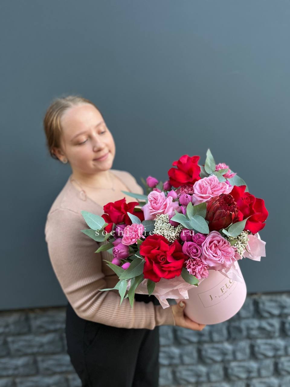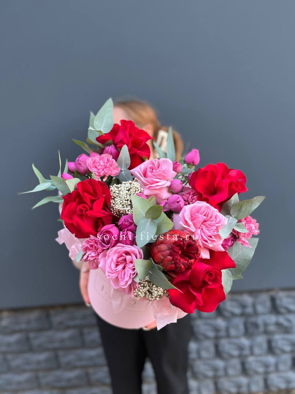Красные и розовые розы создают яркую игру оттенков в просторном боксе. Диантус и озотамнус добавляют воздушности, мисти баблс расставляет акценты.