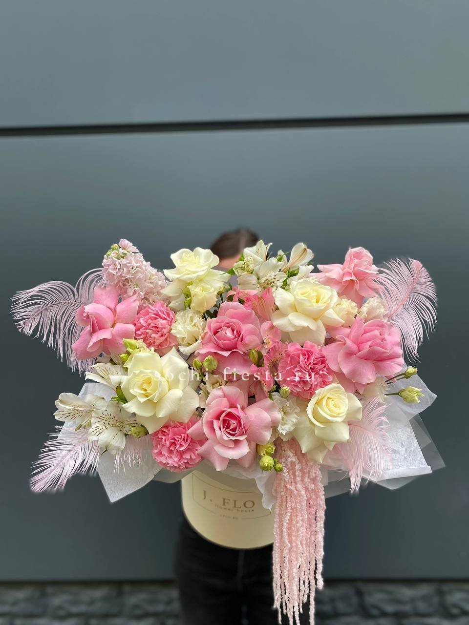 Французские розы и маттиола задают романтичный тон, а амарантус спускается мягкими каскадами за пределы бокса. Перья вносят графичную легкость в общую картину.