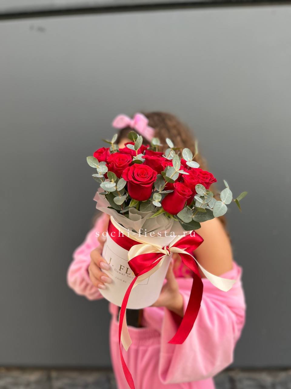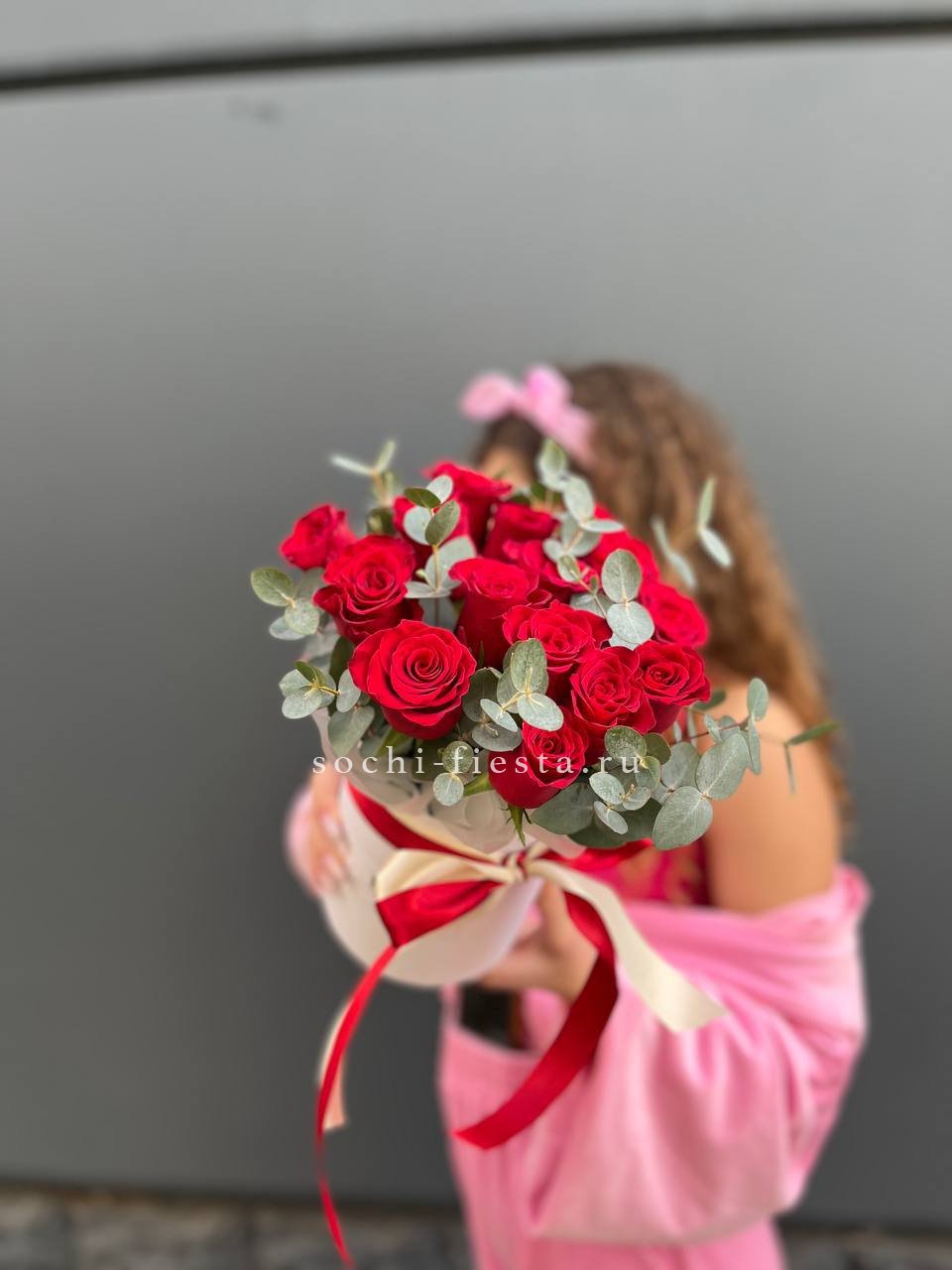 красные розы, эвкалипт, цилиндр D16, лента.