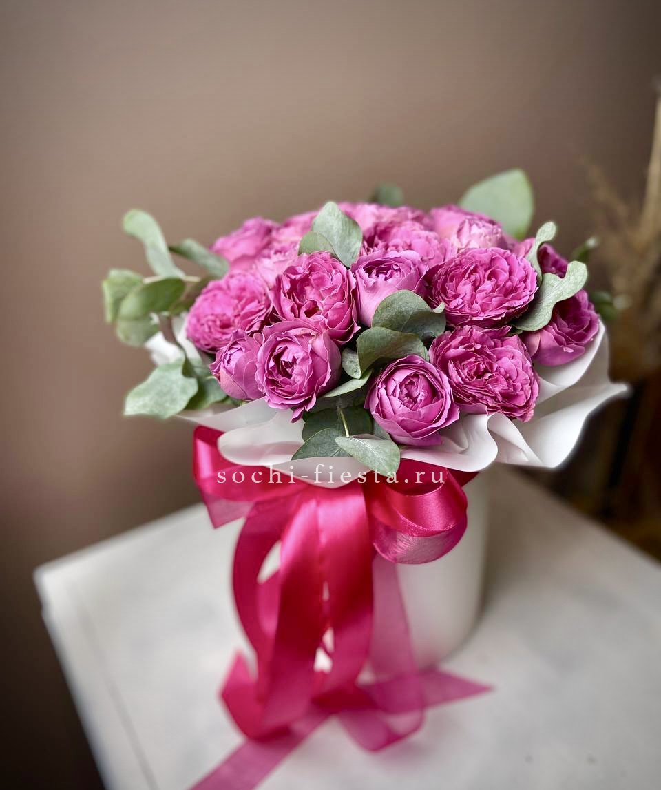 Семь веточек кустовой розы Мисти баблс собраны в круглую форму и дополнены свежим эвкалиптом. Компактная коробка с воздушной бумагой тишью сохраняет композицию аккуратной и готовой к вручению.