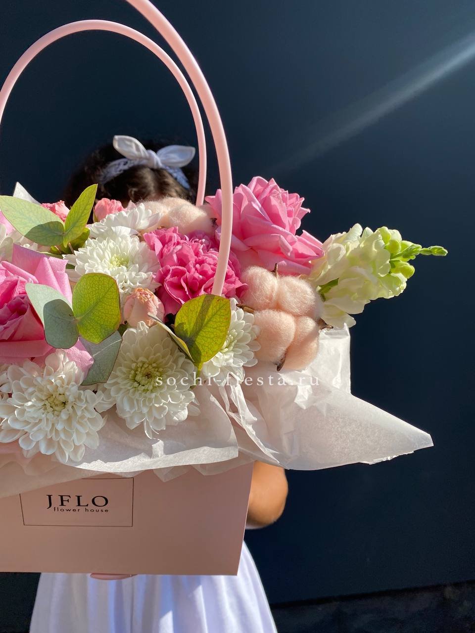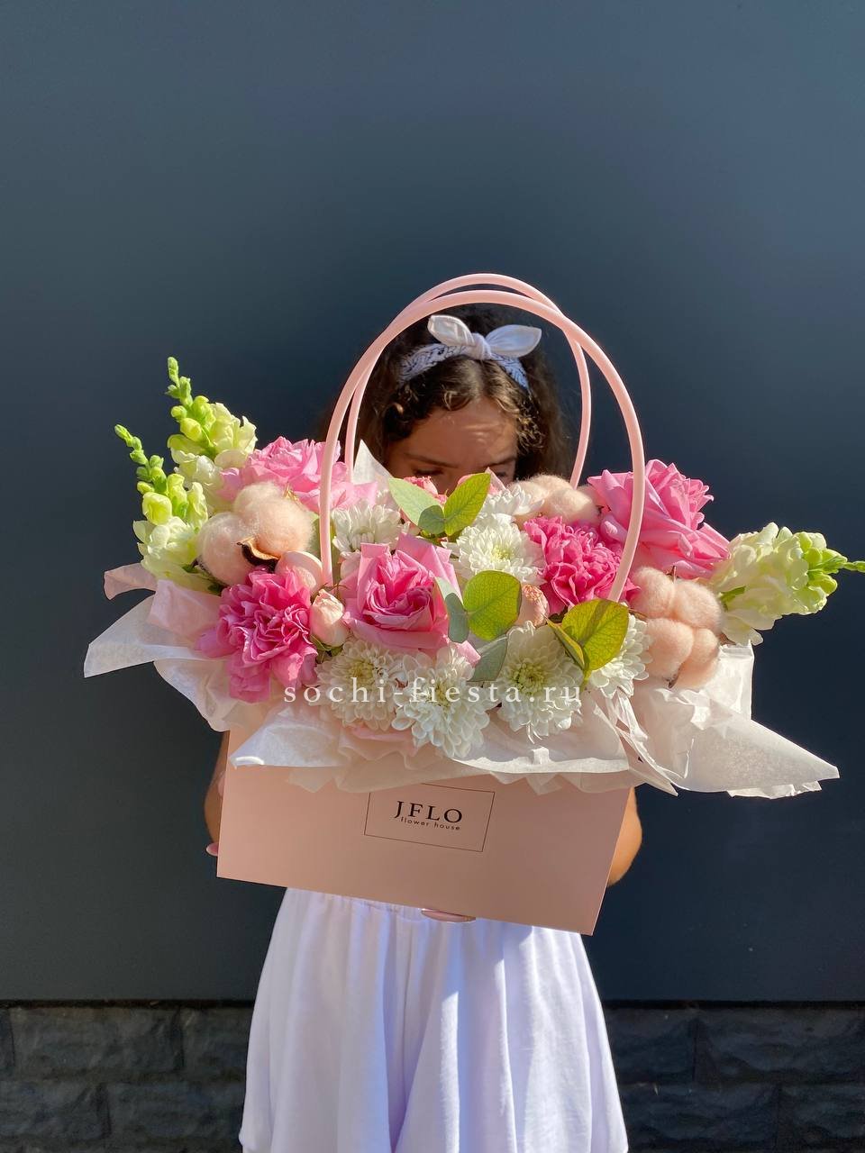 Розовые розы встречаются с орхидеей цимбидиум в объемной сумке-кашпо. Эустома и диантус создают многослойность, а кустовые розы заполняют пространство между крупными бутонами. Композиция держит форму и радует насыщенностью.