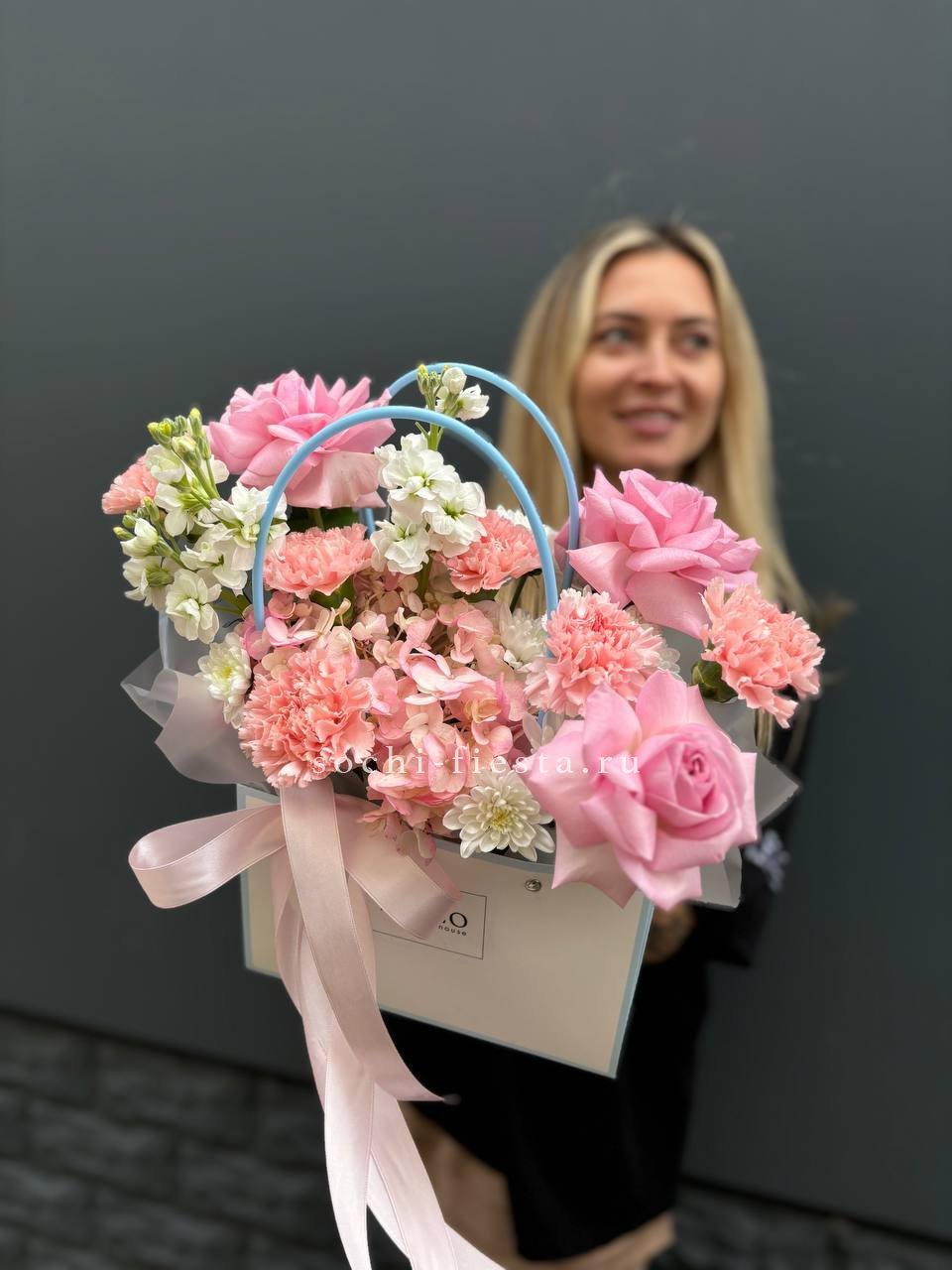 Герберы и маттиола вместе с диантусами выстраивают вертикальный ритм в flower bag. Белая роза и кустовая хризантема добавляют композиции завершенность.