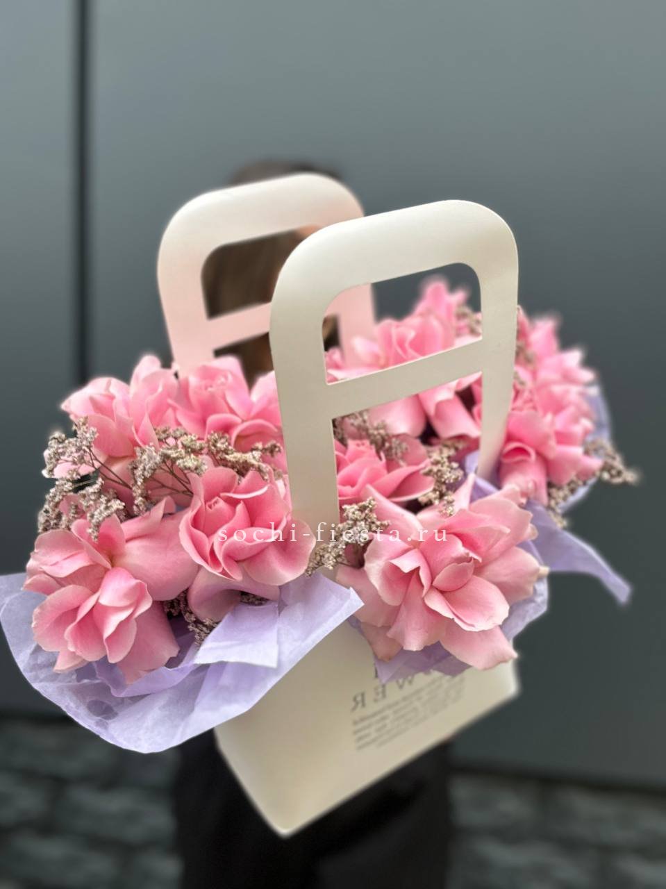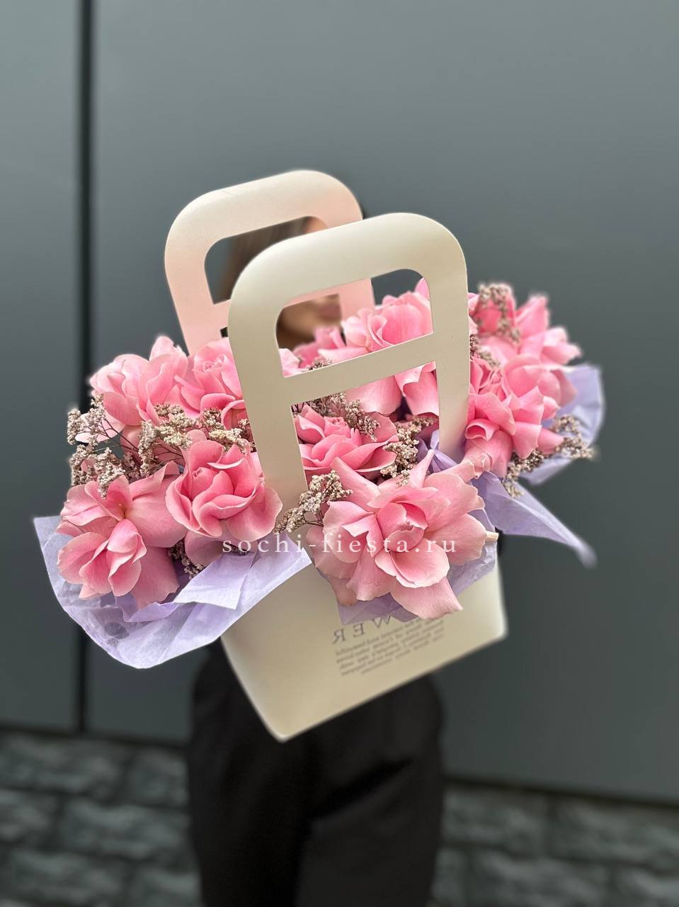 Белоснежные розы переплетаются с воздушной эустомой и раскрытыми лилиями в аккуратной цветочной сумке. Эвкалипт создаёт прохладный фон для светлых бутонов. Композиция на оазисе сохраняет свежесть и форму долгое время.