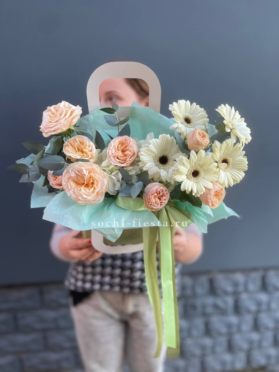 Гортензия создает объемную базу, а герберы и кустовые розы добавляют яркие акценты по всей композиции. Эвкалипт обрамляет сумочку легкими серебристыми ветвями.