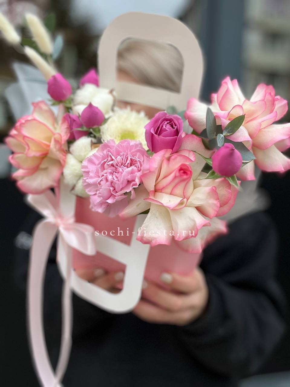 Миниатюрная композиция в удобной сумочке сочетает пышные головки хризантем с бархатистыми розами и воздушным диантусом. Веточки эвкалипта добавляют свежести, а компактная форма позволяет разместить цветы на рабочем столе или прикроватной тумбе.