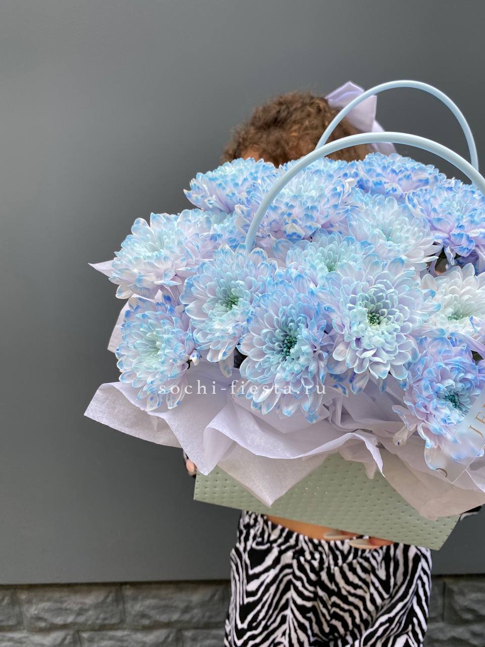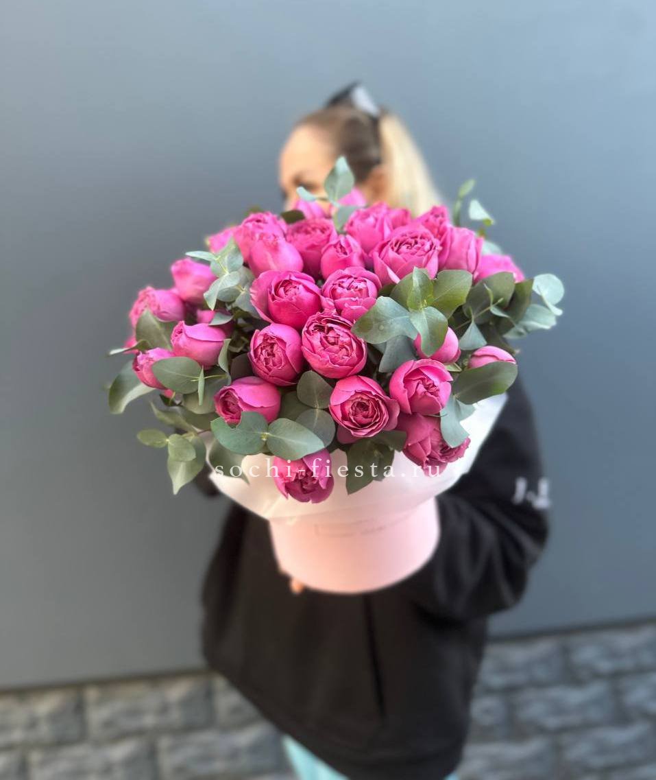 Воздушные головки диантусов собраны в компактную форму с мягкими переходами оттенков. Эвкалипт добавляет свежести и завершает композицию в удобной сумочке.