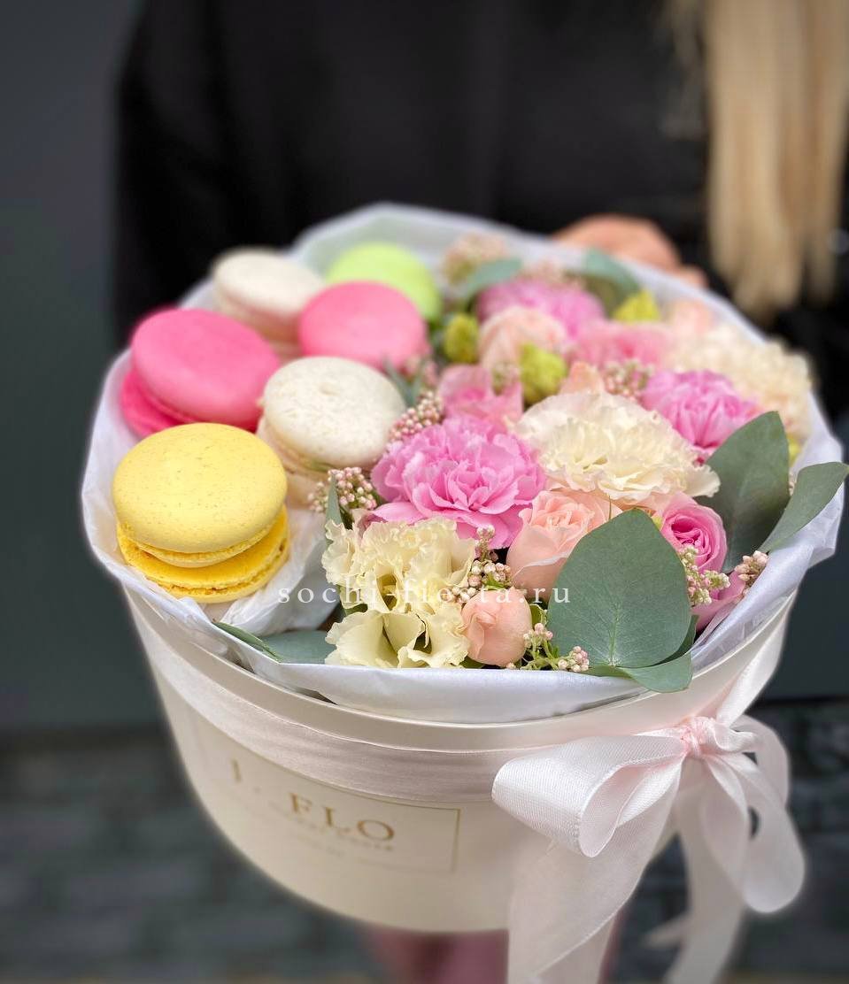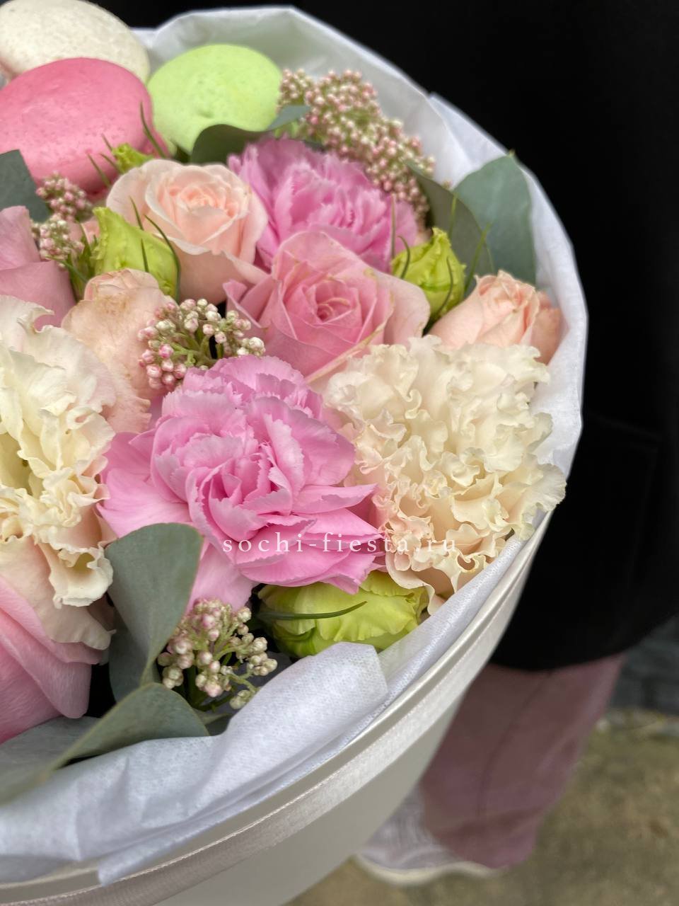 эустома, розы, кустовые розы, диантусы, эустома, озотамнус, макаронс- 6 шт., коробка. Данная цена доступна при заказе от 10 шт.