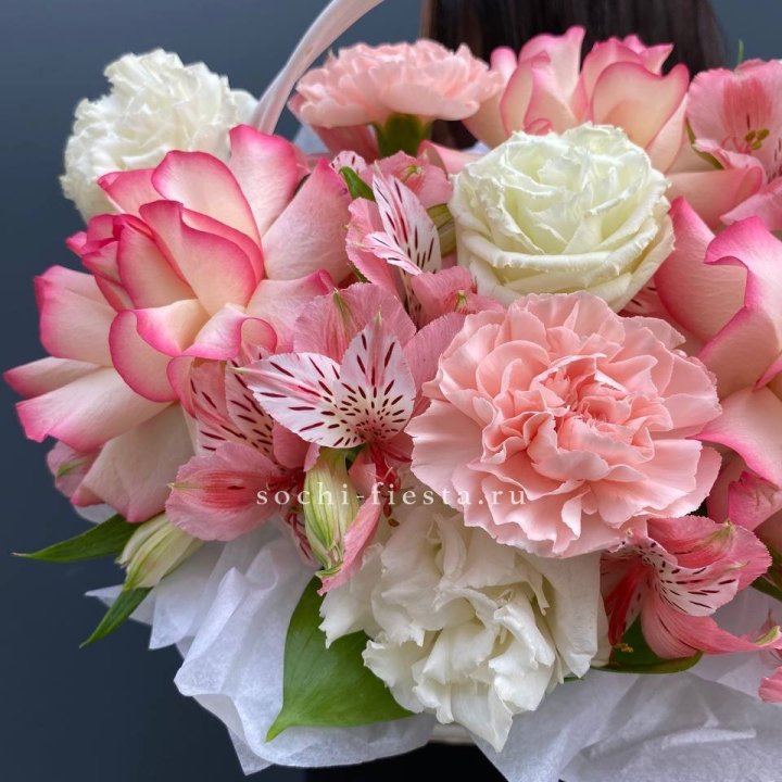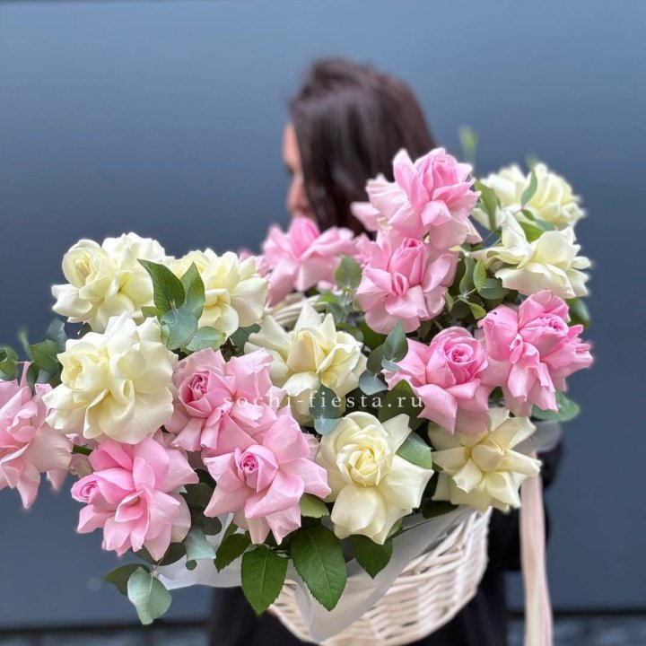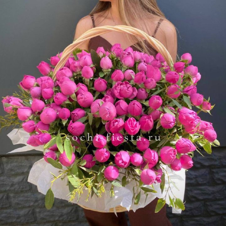 Состав корзин в Подольске строится из лучшего, что есть в текущей поставке. Розы — Freedom, Mondial, Cappuccino — для торжественных куполообразных аранжировок. Пионы в мае-июне: Sarah Bernhardt, Red Charm — главный сезонный продукт. Хризантема кустовая и альстромерия — для объёмных наполнений. Эустома и ранункули — для садового стиля. Флорист создаёт состав под бюджет и повод.