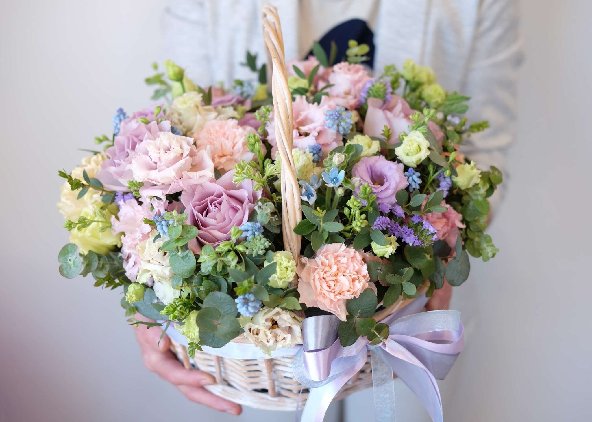 Корзина с шестьюдесятью пятью кустовыми розами Мисти Бабблс создаёт плотное облако из махровых бутонов лавандового оттенка. Эвкалипт добавляет свежести и завершает композицию.