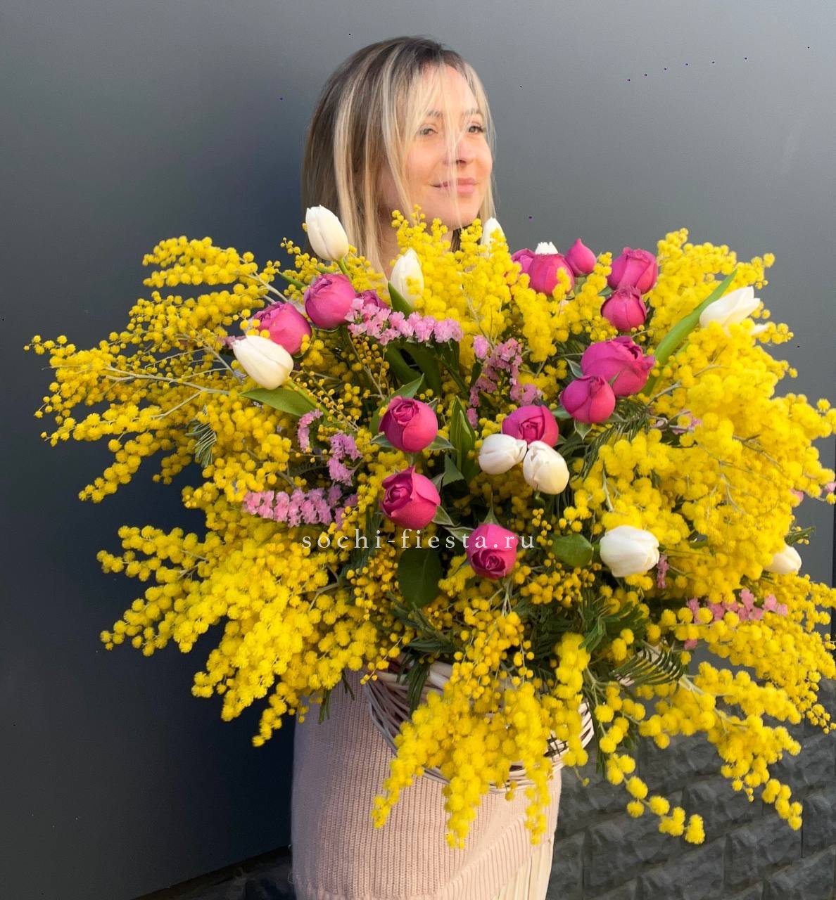 Солнечная мимоза встречается с тюльпанами и пионовидными розами Мисти Бабблс. Весенняя палитра собрана в корзине, где каждый цветок занимает свое место в общем ритме.