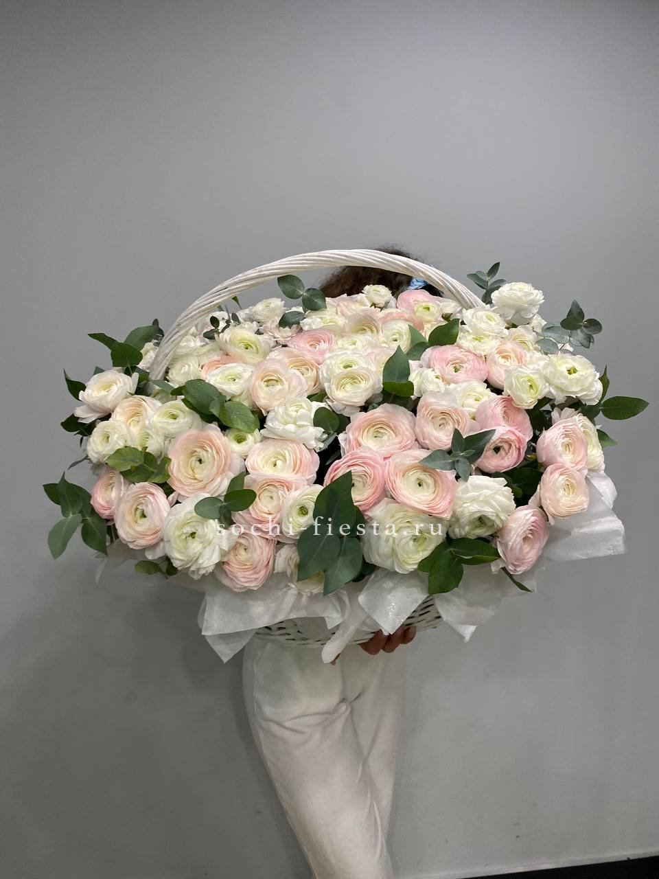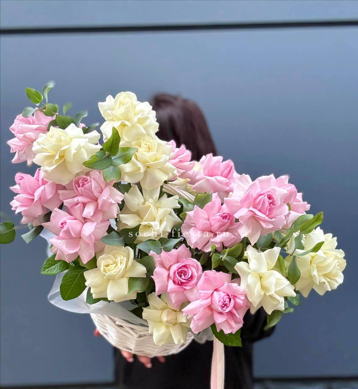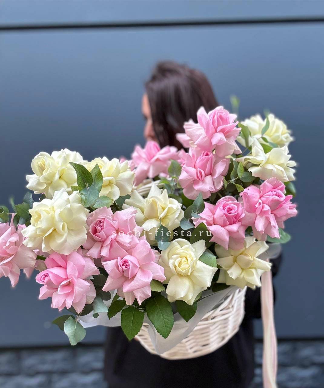 Плотная сферическая форма из пышных бутонов создаёт объёмную композицию в плетёной корзине. Ветки эвкалипта добавляют воздушности между головками цветов. Классическое решение для яркого события или знакового дня в жизни близкого человека.
