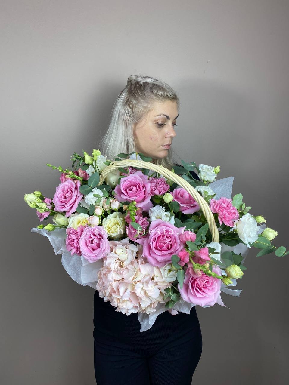 Корзина собрана плотно, каждый цветок находит своё место в общей композиции.