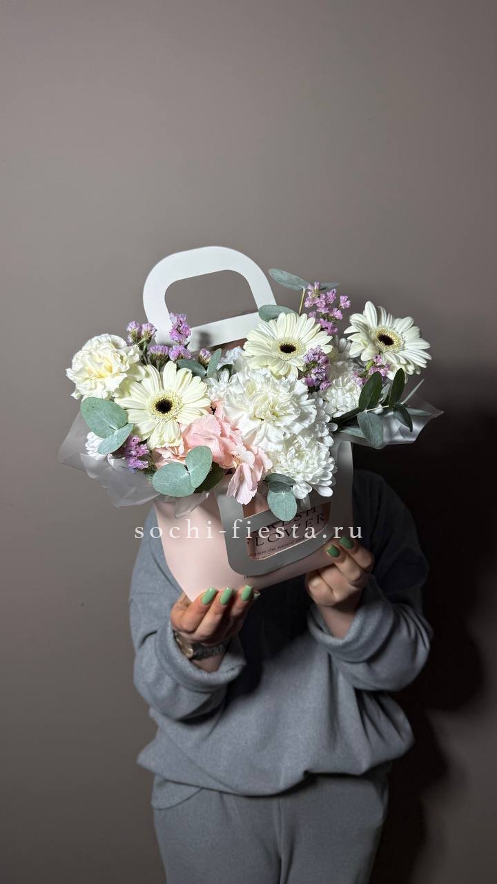 Пять кустовых роз Мисти Бабблс раскрываются пышными головками с волнистыми лепестками. Эвкалипт добавляет свежести и объема. Композиция помещена в удобную сумочку.